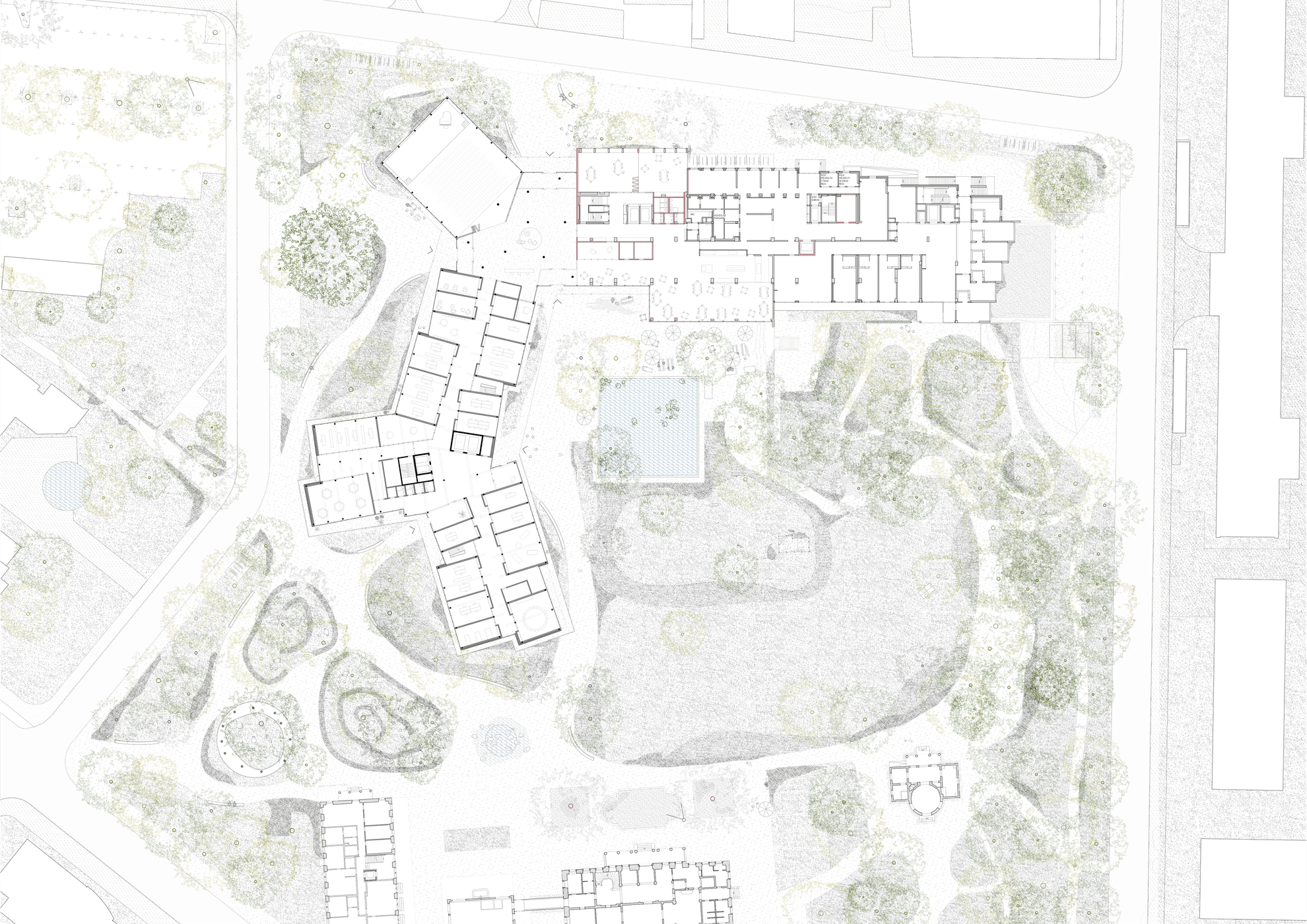Mit diesen Prämissen ist es offensichtlich, dass die bisher am Ort verwendete Typologie von Gebäude zu Park und zur inneren Organisation mit der geplanten Ergänzung eine umfassendere, rücksichtsvolle und synergetische Haltung benötigt. So soll jedes Element in sich schlüssig sein und gleichzeitig das umliegende in seiner Eigenart stärken.