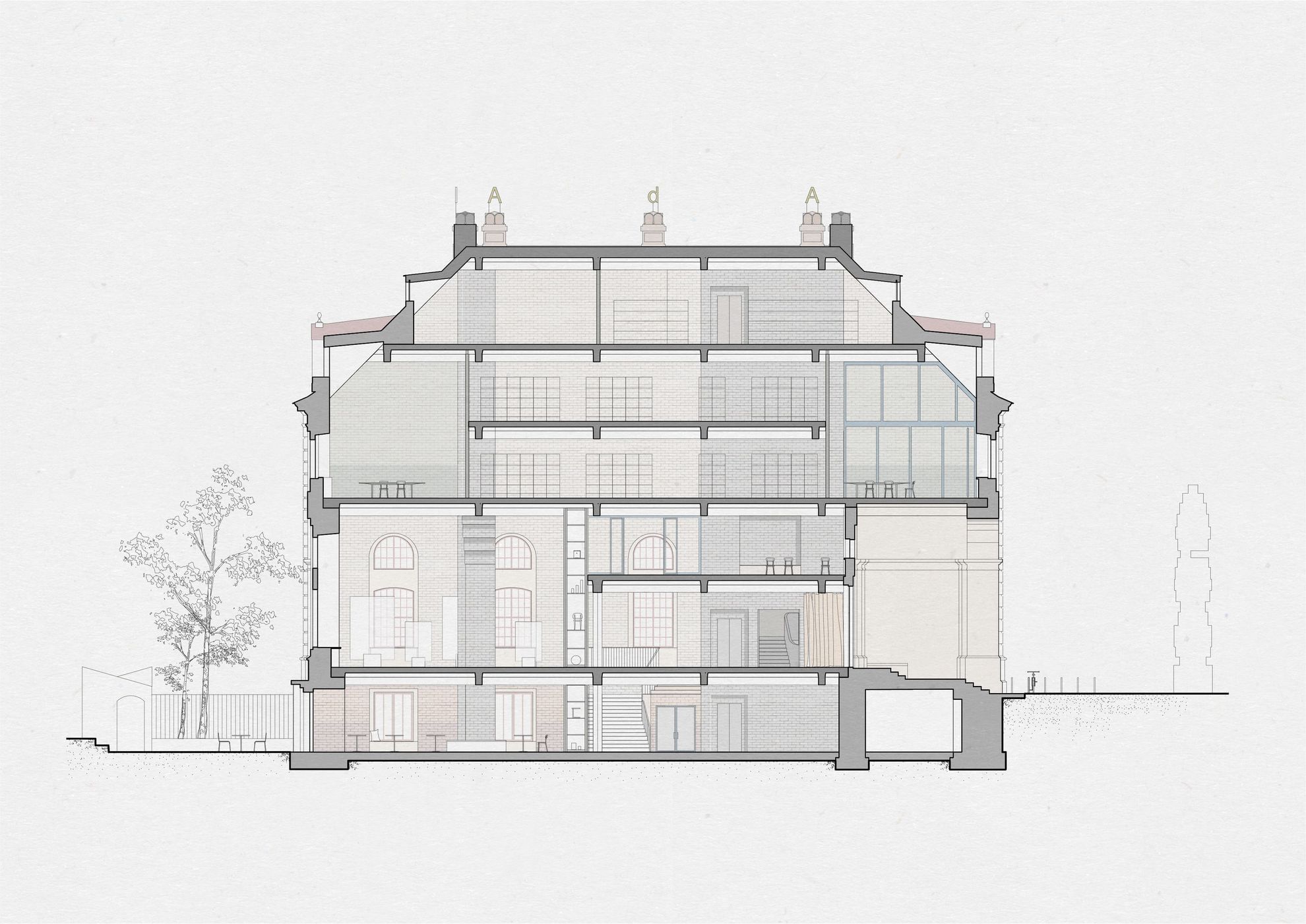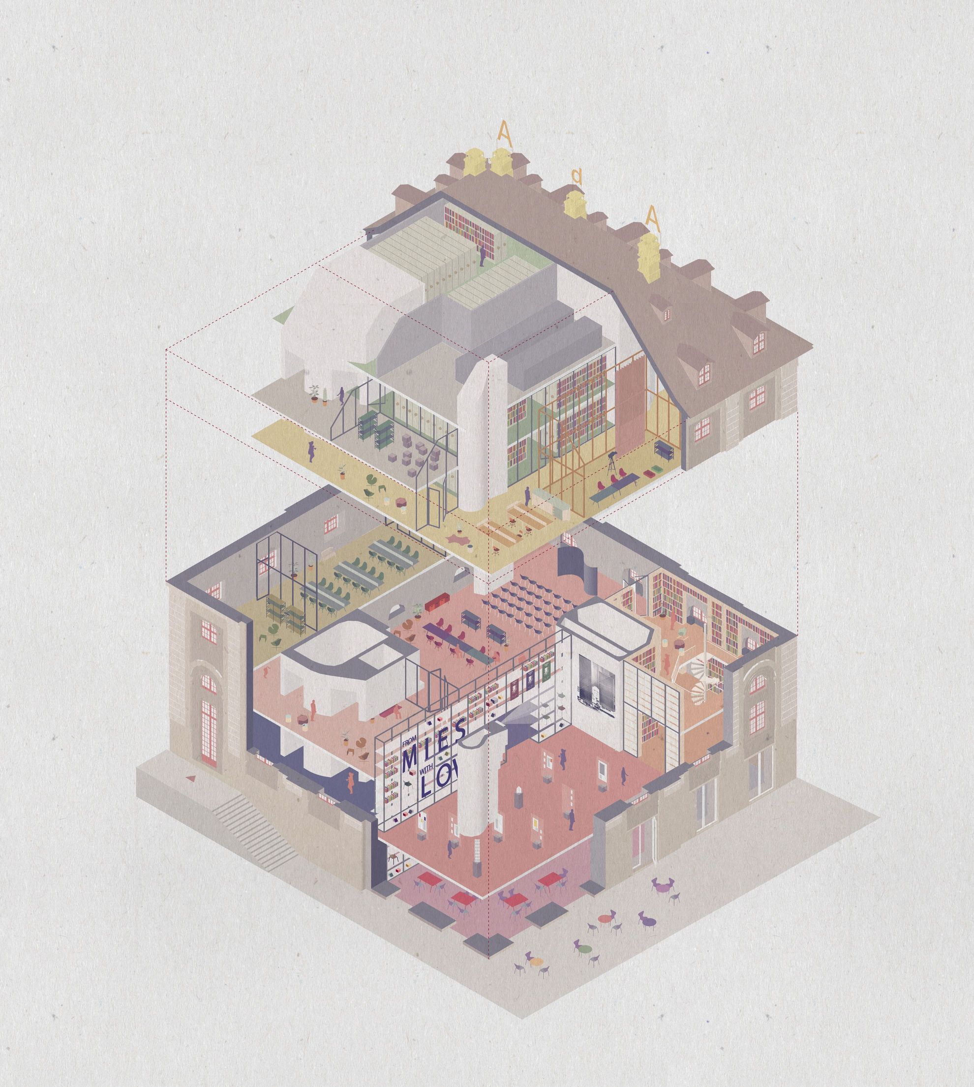 Zusammen mit der Sammlung und der Forschungsplattform des AdA soll das Archiv als narratives Element das Haus bestimmen. In unserem Projekt ist das Archiv überall präsent und mit allen Räumen verbunden. Der Entwurf zelebriert die Hauptkonzepte der Avantgarde: fließende Räume, Auflösung von Hierarchien und Äquivalenz der Kunstgattungen mittels Architektur.