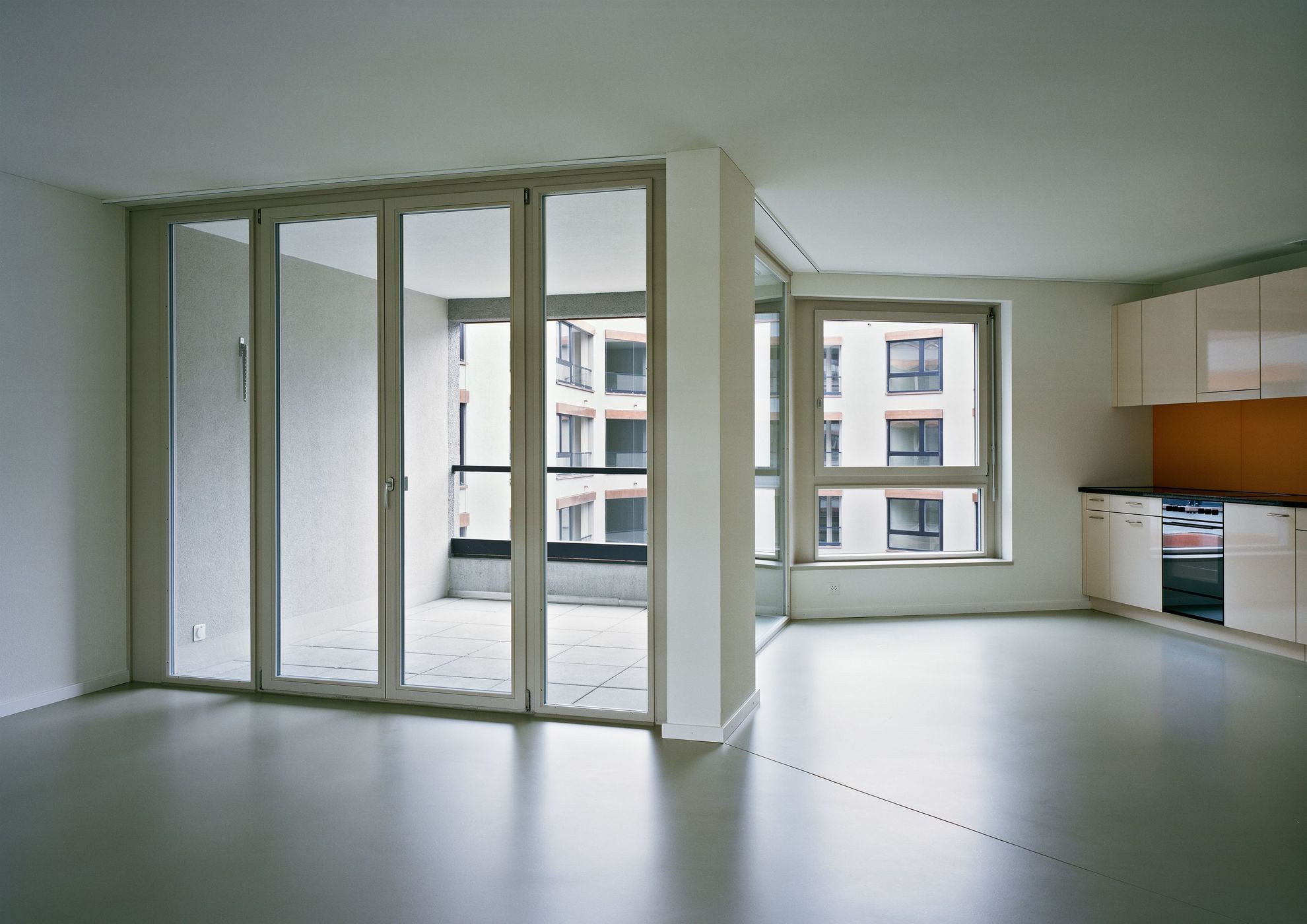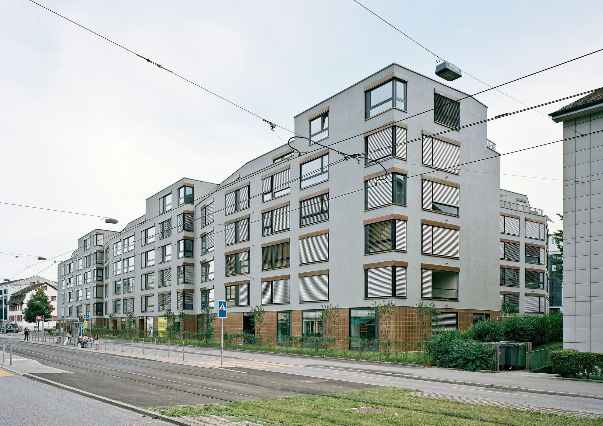 Das Gebäude besetzt ein bisher unbebautes Grundstück mit schwierigen Randbedingungen bezüglich Geometrie und Lärm in einem Quartier mit vorwiegend günstigen Wohnungen. Primäre Ziele waren, eine maximale Dichte mit guten städtebaulichen Eigenschaften zu verbinden, und dabei die drei bestehenden Parzellen unabhängig voneinander bebauen zu können. Entlang der städtischen, relativ lärmigen Strasse wird eine geschlossene, mit Zäsuren in drei Abschnitte gegliederte Fassade etabliert. Zwei organisch angelegte Höfe nach Süden - zur Ruhe, zur Sonne und zum Wohnquartier hin kontrastieren dazu. Die beiden Höfe erlauben es, alle Wohnungen entlang der Badenerstrasse gemäss den Lärmvorschriften durchgehend zu gestalten und auch an den Höfen partizipieren zu lassen. Die organische Form ermöglicht es, Ausrichtung und Dichte graduell zu steuern und zu optimieren, ohne an die Systematik üblicher Grundrisse gebunden zu sein: Die Wohnungen erhalten organisch geformte Raumzuschnitte, mit individueller Ausprägung nach Lage und Grösse. Wichtiges Element der Raumgliederung sind die eingezogenen Loggien, die trotz hoher Dichte eine angenehme Privatheit aufweisen.