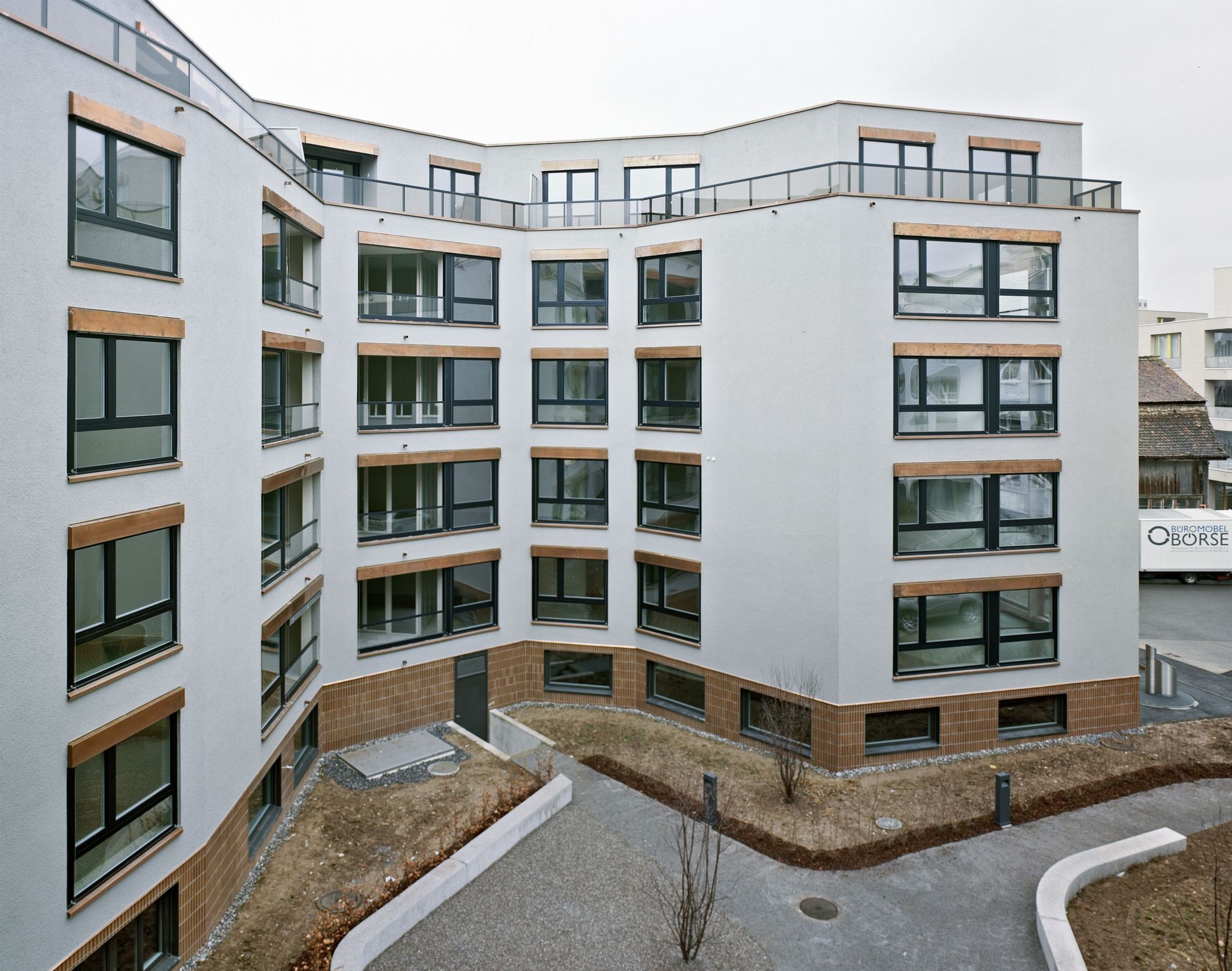 Der architektonische Ausdruck orientiert sich an städtischen Gebäuden mit verputzter Aussenwand und grossen Öffnungen, die in ihren Dimensionen mit dem städtischen Raum kommunizieren und gleichzeitig ein spannungsvolles Verhältnis von Öffnung und Wand suchen. Die Fenster liegen in einer nur flachen Leibung und sind mit breiten Fensterrahmen und in Kupfer ausgebildeten Storenkästen sowie Fensterbrettern gut sichtbar konstruiert, um dem Ausdruck einen erkennbaren Charakter zu verleihen angesichts der sehr günstigen Aussenwandkonstruktion. Das Erdgeschoss ist strassenseitig entsprechend dem öffentlichen Anspruch der Gewerbenutzung und der Eingänge als Sockel ausgebildet und mit keramischen Platten verkleidet. In der Gesamtwirkung verbindet das Gebäude Eigenschaften eines städtischen Blocks mit einer gewissen Objekthaftigkeit, die dem anonymen Ort eine spezifische Identität verleiht.