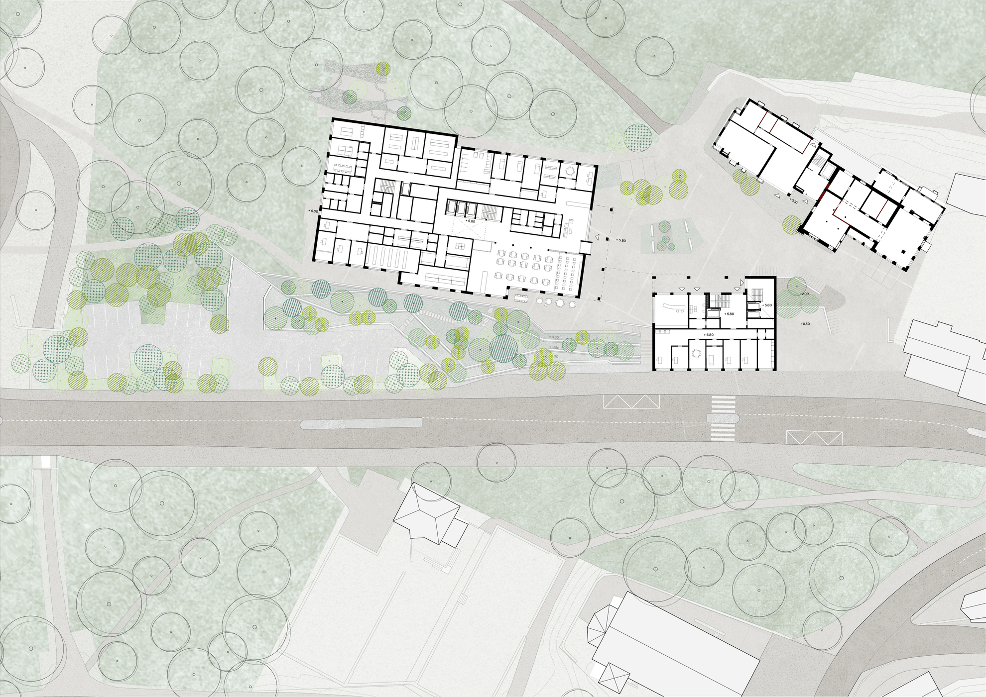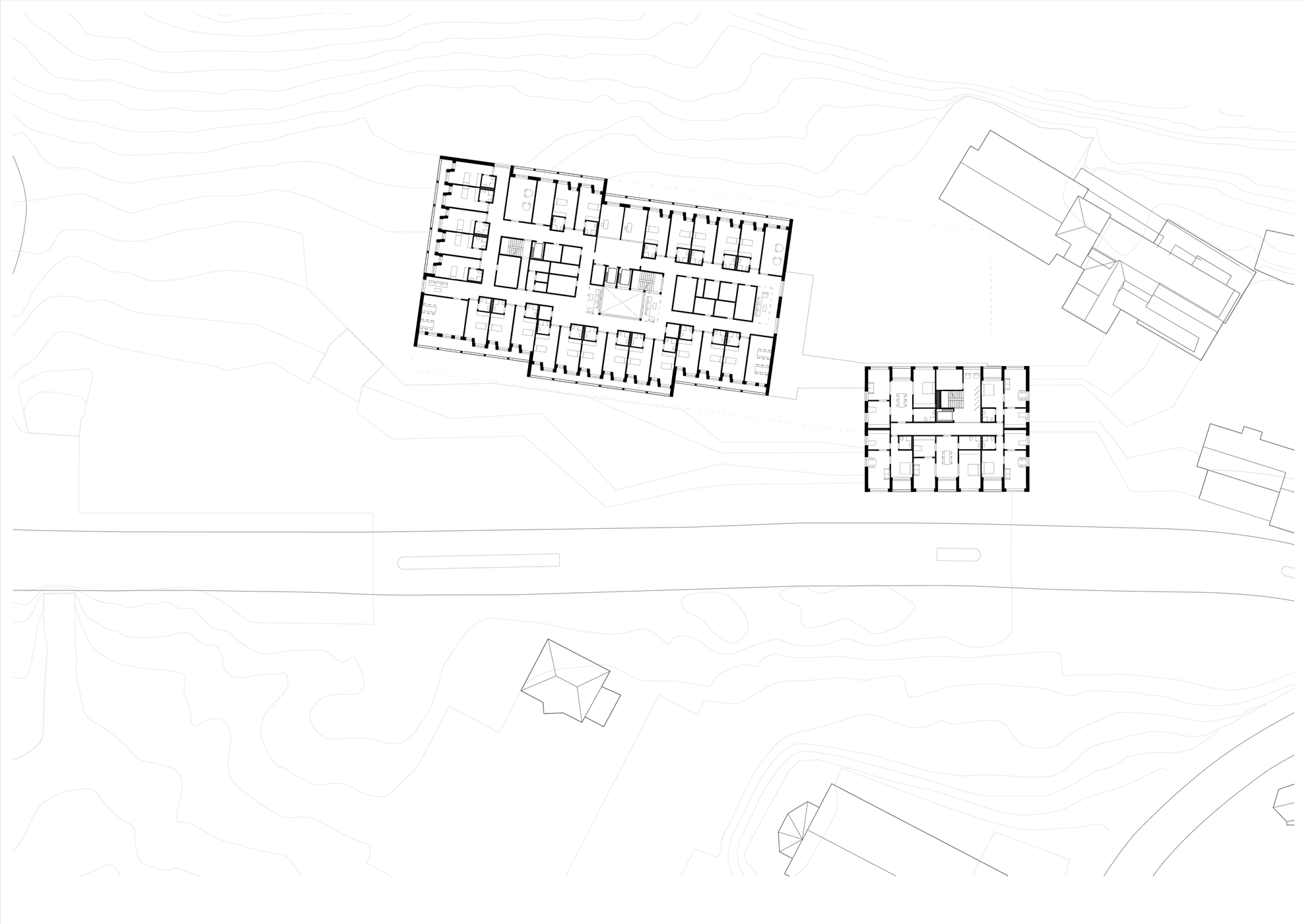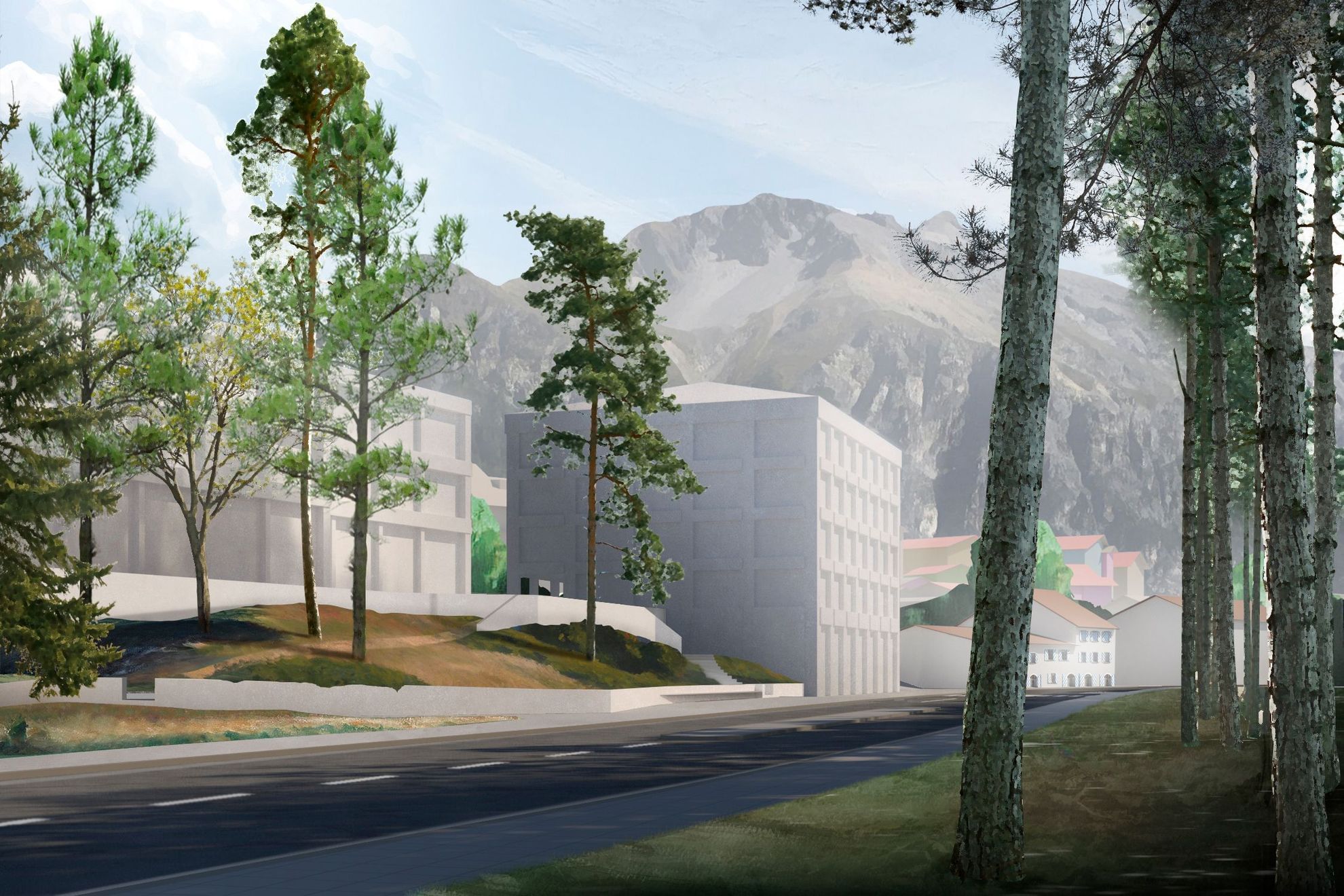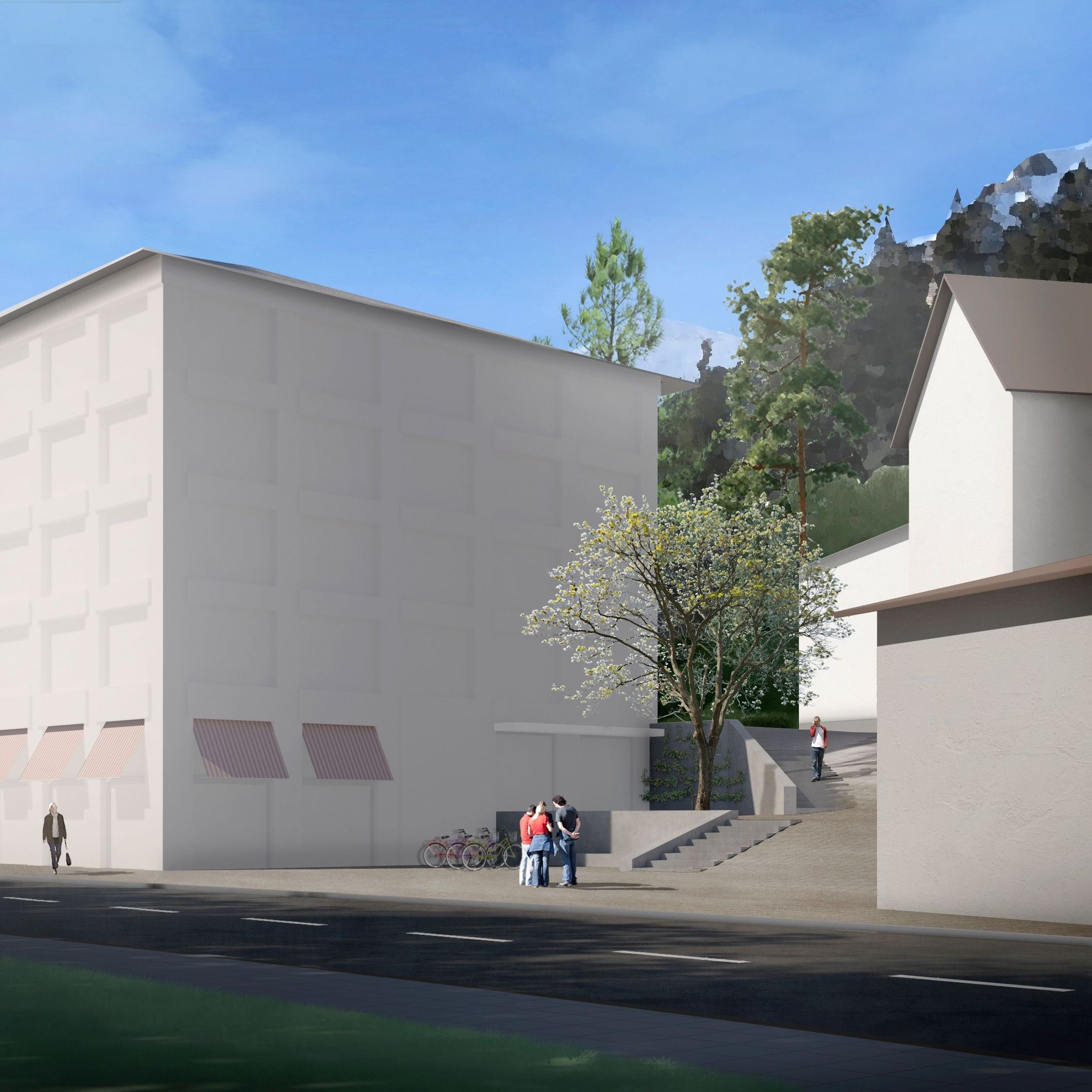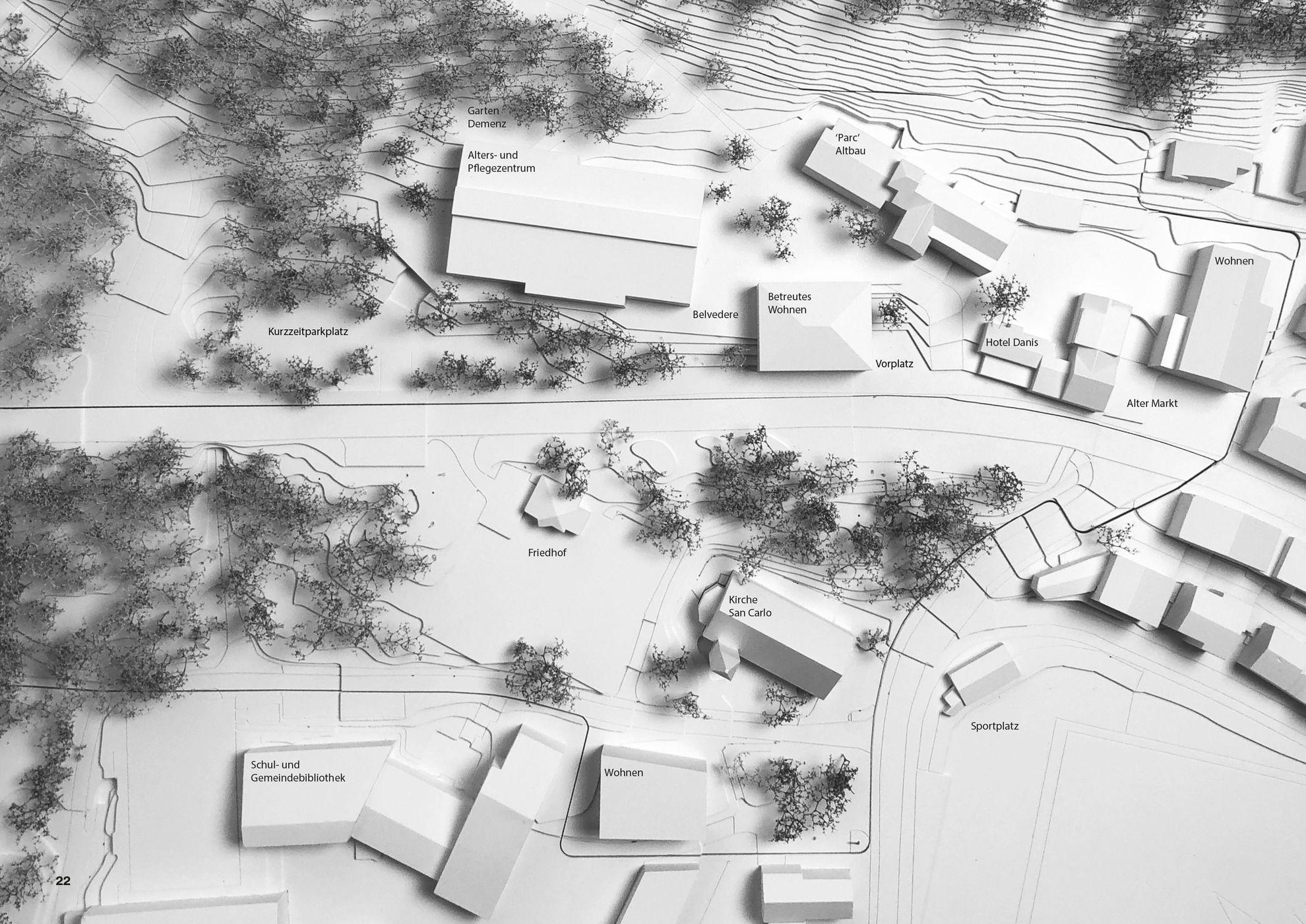Das Pflegeheim mit dem öffentlichen Restaurant kommen an diesem Belvedere zu liegen. Als Volumen erinnert es an die grossen, typischen Hotelbauten in den Bergdörfern.