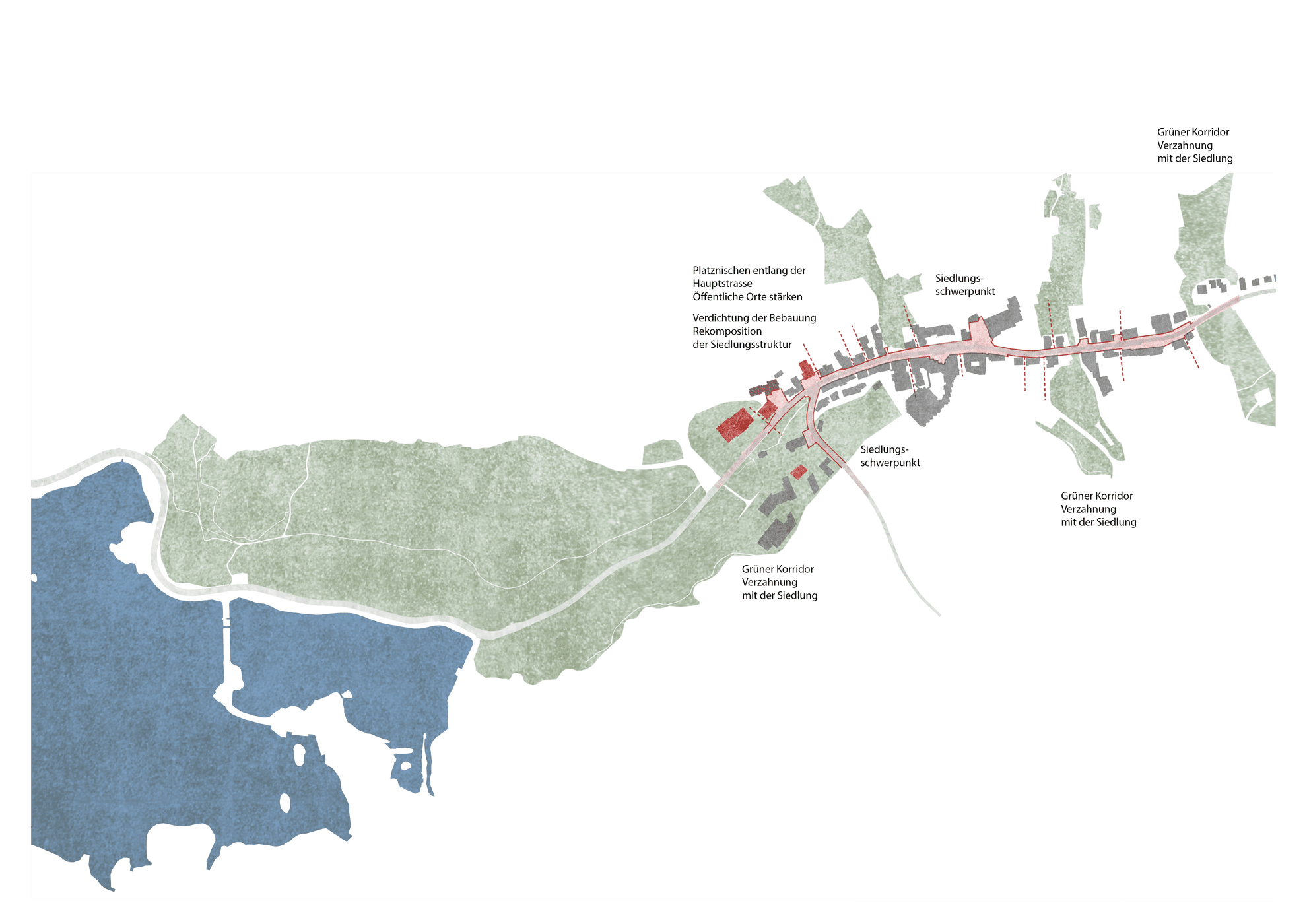 Mit unserem Ansatz der Planung soll die Qualität der Verwebung von Landschaft und Siedlung gestärkt und radikalisiert werden. Die Qualität der Landschaft ist wohl der beste Grund, um die Gegend zu schätzen und soll langfristig nicht nur erhalten, sondern gestärkt werden. Das heisst auch, dass Verdichtung im Inneren der Siedlungscluster stattfinden soll und folgend auch, dass Bebauungen an den Rändern zur Landschaft besonders sorgfältig und bezugsreich zu Dorf und Landschaft zu planen sind.