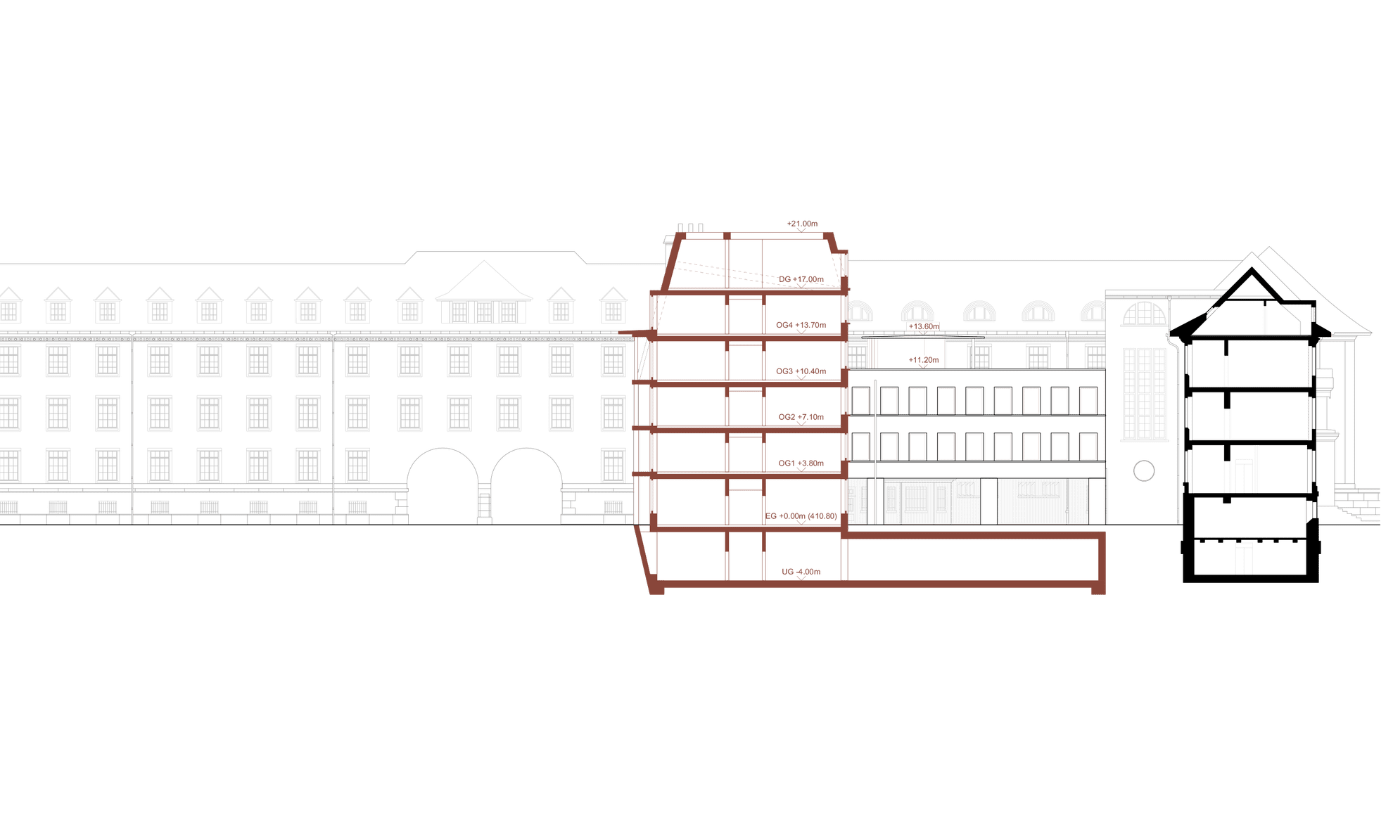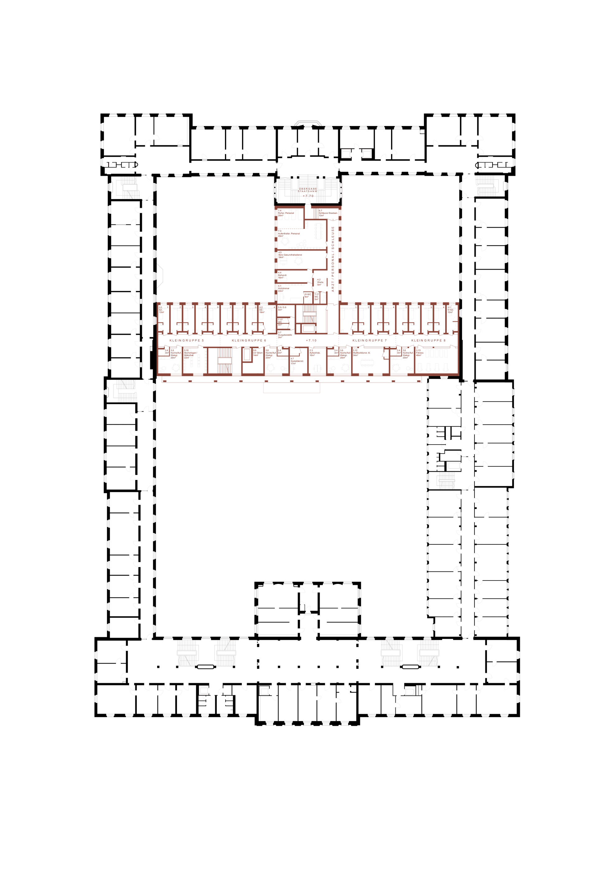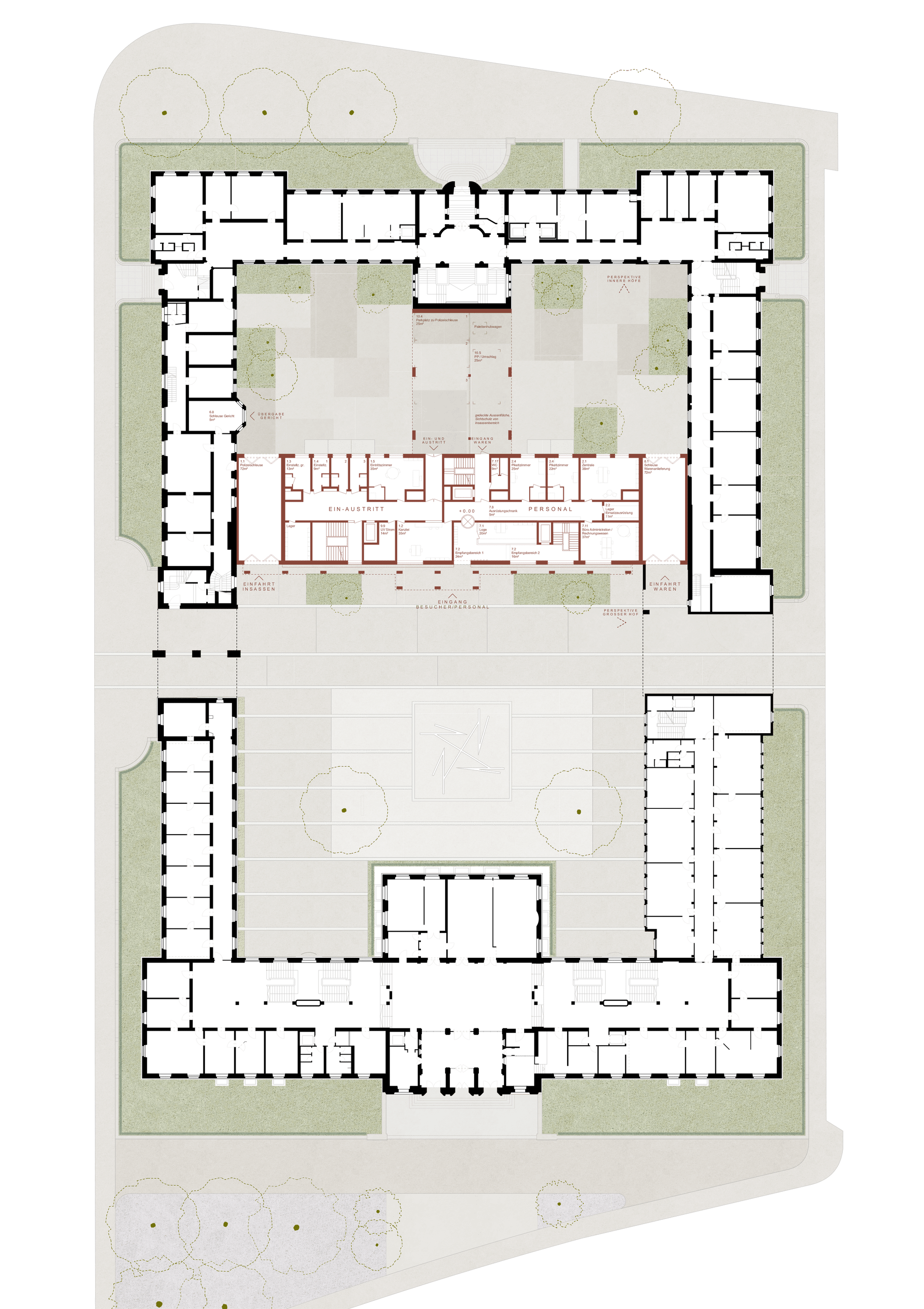 Dank des offenen Erdgeschosses des Zwischenbaus kommen beide Höfe ohne zusätzliche Überdachungen aus und erhalten so ihre ursprüngliche Proportion. Durch die geringe Höhe des Zwischenbaus bekommen sie mehr Licht und eine räumliche Ahnung des jeweils anderen Hofes. Die Hülle ist wenig ausgesetzt und kann als glatte Fassade mit Lehmziegeln verkleidet werden, so dass sie an die ursprüngliche ornamentlose Fassade des Gefängnistrakts erinnert und diese in die Zukunft trägt.