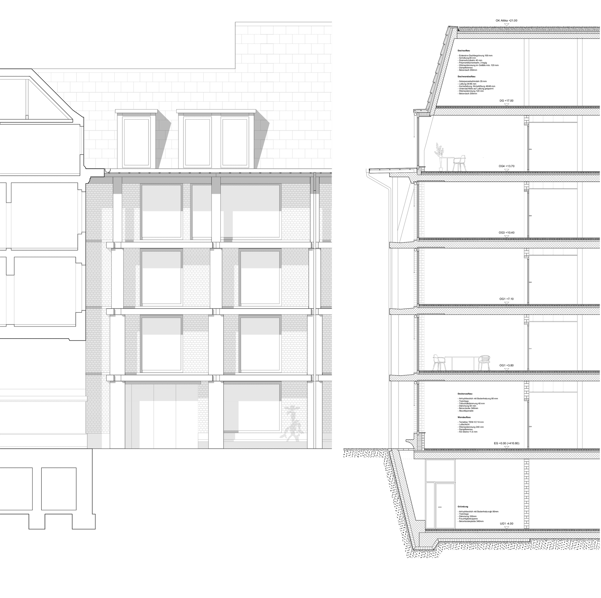 Der Begriff Nachhaltigkeit wird oft oberflächlich als verbreiteter Gemeinplatz verwendet. Unser Ansatz ist eine differenziere Betrachtung und Ausarbeitung verschiedener Teilaspekte eines Entwurfs. Folgende Bereiche halten wir bei diesem Projekt für relevant: Die einfache Struktur und Vertikalerschliessung als robuster Skelettbau mit Stützen und Flachdecken ist zwar pragmatisch, wird mit den wenigen Festlegungen aber über sehr lange Zeit bestehen bleiben (80 Jahre+). Die Struktur des Gebäudes kann auch eine radikale Nutzungsänderungen, etwa als Büro- oder Amtsnutzung aufnehmen. In diesem Fall sind die Geschosse über Differenztreppen anbindungsfähig an die Randbauten. Strukturell ist eine Aufstockung im rückwärtigen Bereich problemlos möglich. Die Umbaufähigkeit der Fassaden bei grossen Nutzungsänderungen oder technischer Obsoleszenz ist gegeben. Zum grossen Hof hin sind dank der Lage der thermischen Hülle in der zurückliegenden Schicht weitreichende Veränderungen möglich, bei konstanter Qualität der Erscheinung und Wirkung zum Hof. Die Lehmziegel können wiederverwendet oder anderweitig in den Materialkreislauf zurückgeführt werden. Das Einbauen von anderen Öffnungen, Anpassungen an Einsicht, Transparenz etc. sind einfach möglich. Durch die beabsichtigen Nutzung erhalten alle relevanten Räume Tageslicht, wo möglich auch Aussicht und Weite. Um die zukünftige Flexibilität gross zu halten wurden alle inneren Einteilungen flexibel, Schächte dezentral und Leitungen als additive Systeme geplant.