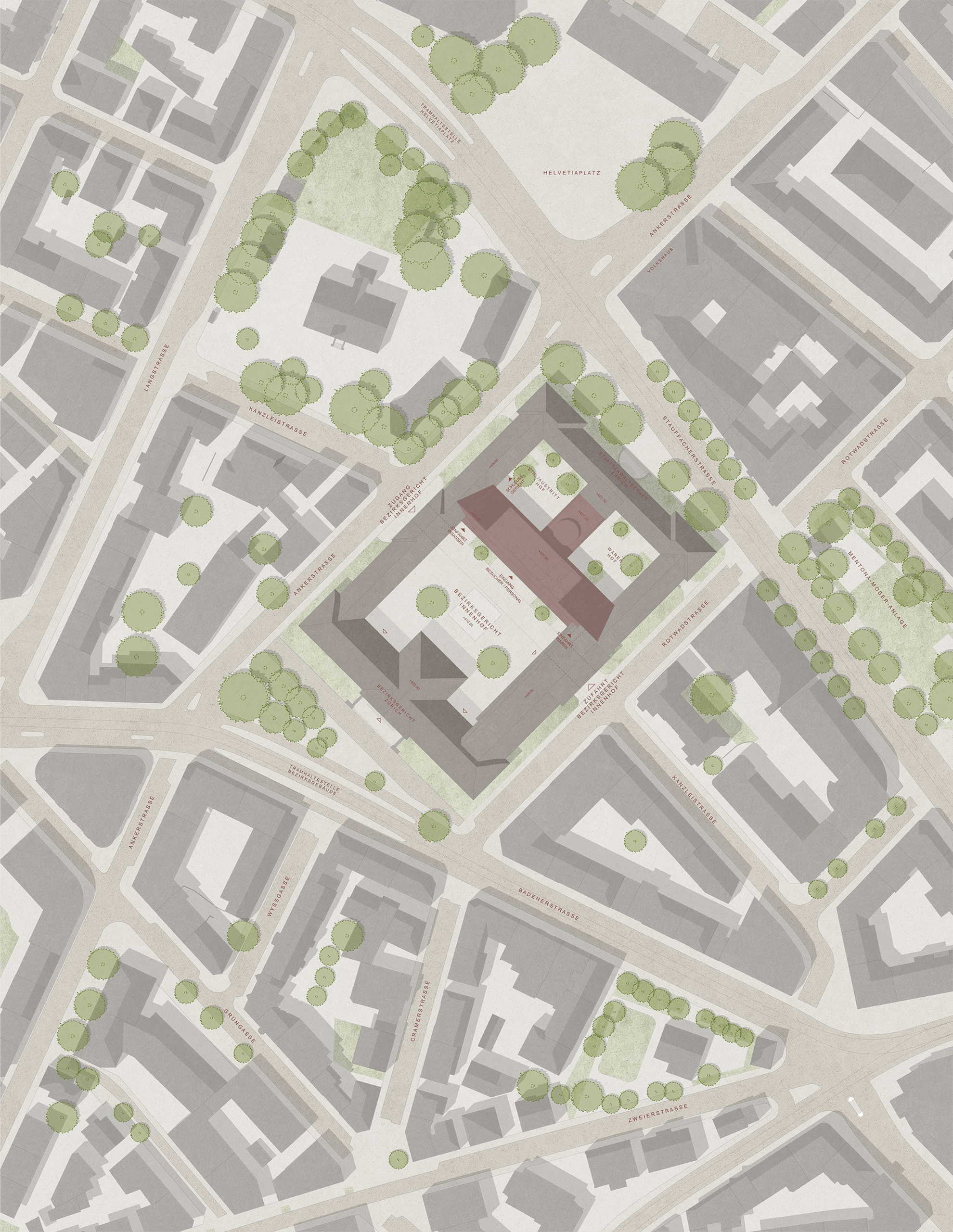 Das Bezirksgebäude umfasst ein ganzes Geviert im Kreis 4 und nimmt mit seiner Erscheinung als umlaufender Block einen raumbesetzenden, objekthaften Charakter an. Es wird in der Mitte durch eine Verbindung von Block und Hof in seiner Hermetik abgemildert und integriert sich in das Netz der öffentlichen Verbindungen. Damit wird der grosse Hof zu einem öffentlichen Stadtraum mit entsprechenden «Verpflichtungen» bezüglich Repräsentanz einer städtischen Physiognomie. Unabhängig von der inneren Nutzung, die mit einem Gefängnis sehr spezifisch und kleinteilig ist, soll das Gebäude eine davon unabhängige Präsenz und Ausstrahlung haben, um damit die Grundlage für Langlebigkeit und Resilienz im Stadtraum zu bilden. Dazu gehört primär, die neue Hofbegrenzung als Teil der bestehenden Umfassung einzubinden, und gleichzeitig langfristig günstige Bedingungen zu schaffen, um innere Nutzungen und Umbauten zu ermöglichen, ohne den äusseren Zusammenhang des Hofes zu gefährden.