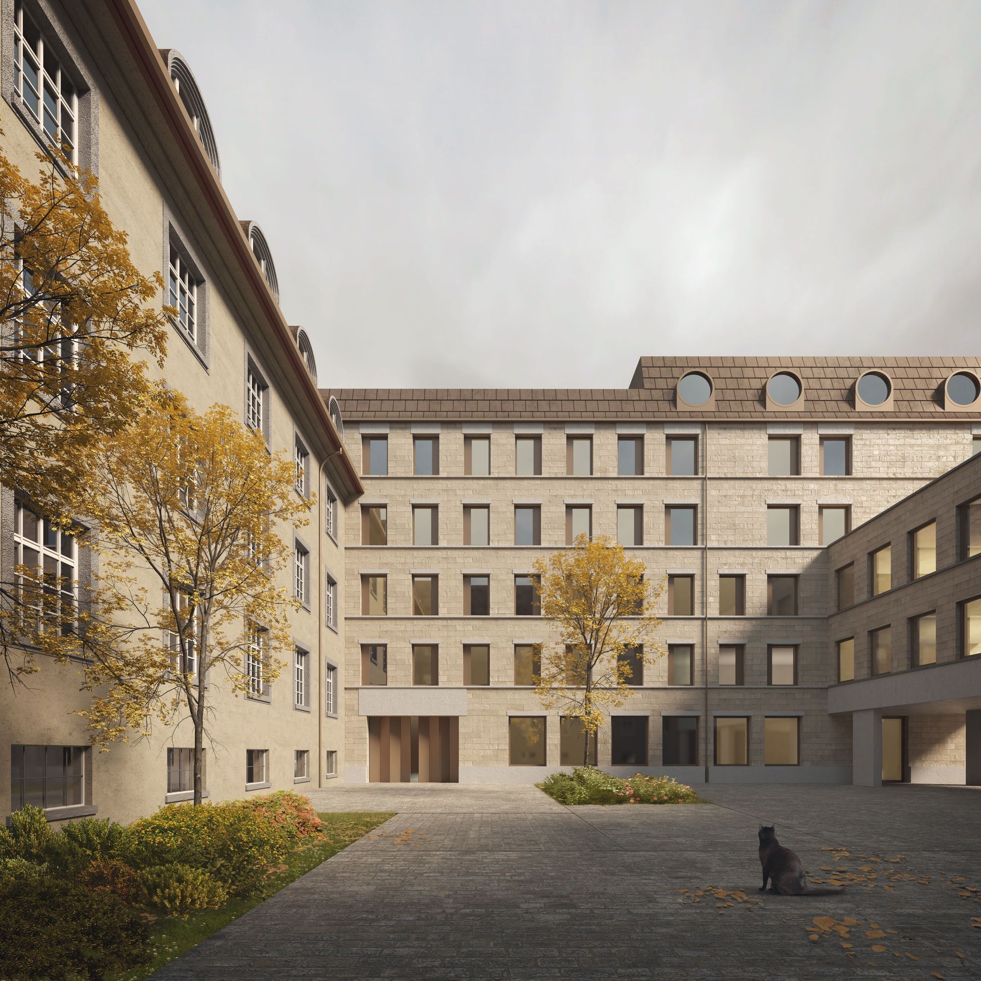 Das primäre Vorgehen zur Einbindung ist die gesamtheitliche Fassung des Hofraumes: Dachuntersicht, Gesims und Dachkontur folgen den historischen Hauptelementen der ursprünglichen Fassung des Hofes mit einem durchlaufenden, schattenbildenden Horizont als oberem Abschluss. Diesem prioritären Element zugeordnet ist eine vorgelagerte, raumhaltige Struktur, deren Proportionen und Dimensionen eine umlaufende Kontinuität mit dem Rhythmus der Fensterachsen ergeben, während die dahinter liegende Wand die räumliche Begrenzung bildet, mit einer grossen Freiheit in den Verhältnissen zwischen innerer Fassade und äusserer Struktur. Durch dieses Gesicht zum Hof wird das Gebäude als öffentlicher Bau charakterisiert, mit entsprechend erkennbarer Adressbildung. Dabei erzeugt das vorstehende Dach mit dem Eingang zum Haus eine leichte Irritation zwischen der lokalen Symmetrie der Fassade und der Symmetrie der Anlage.