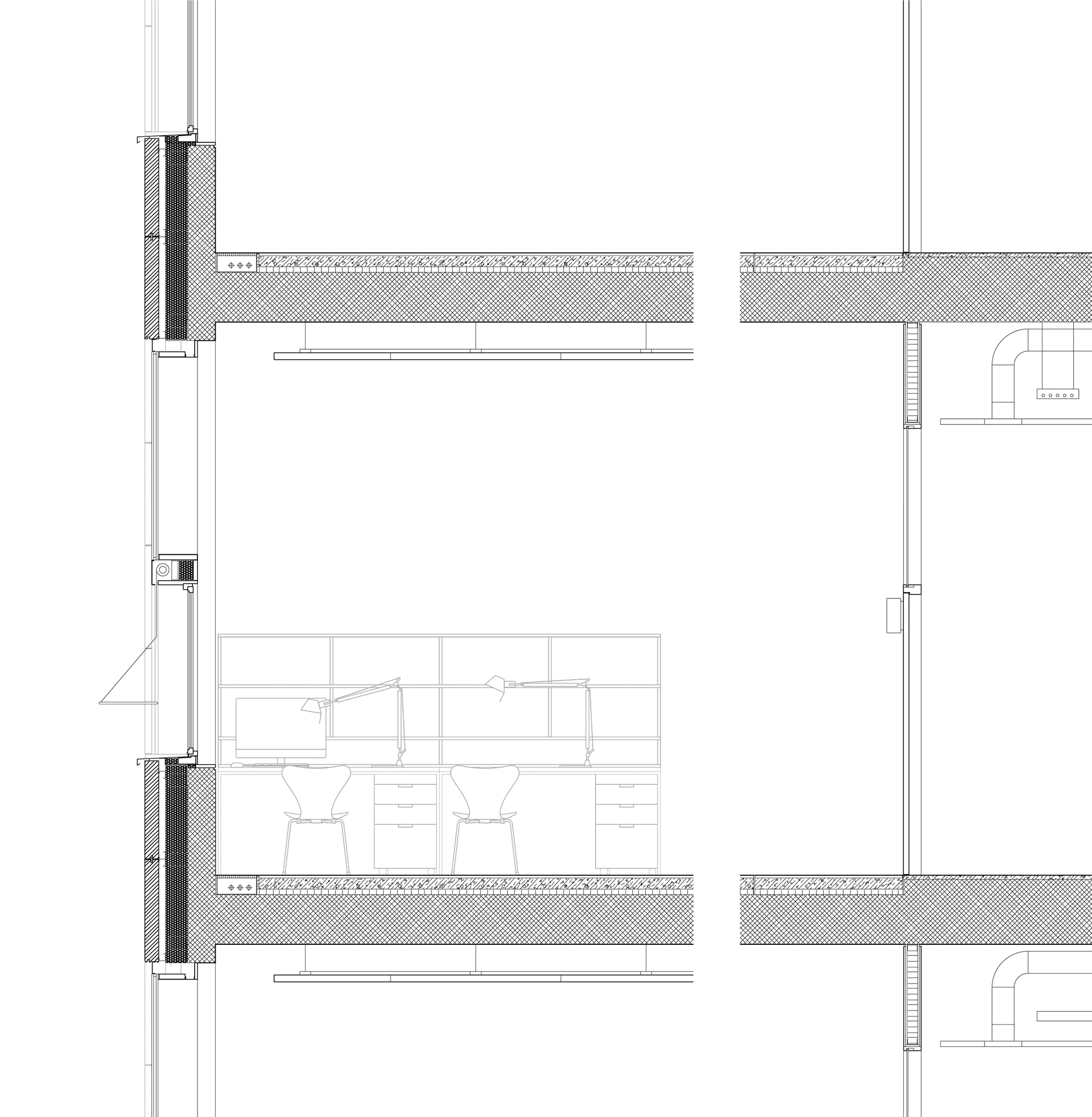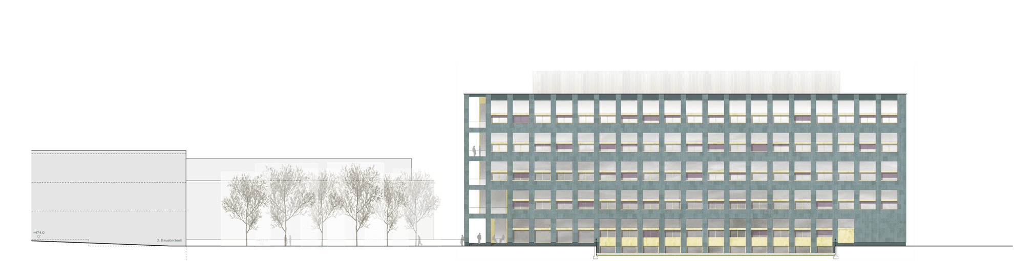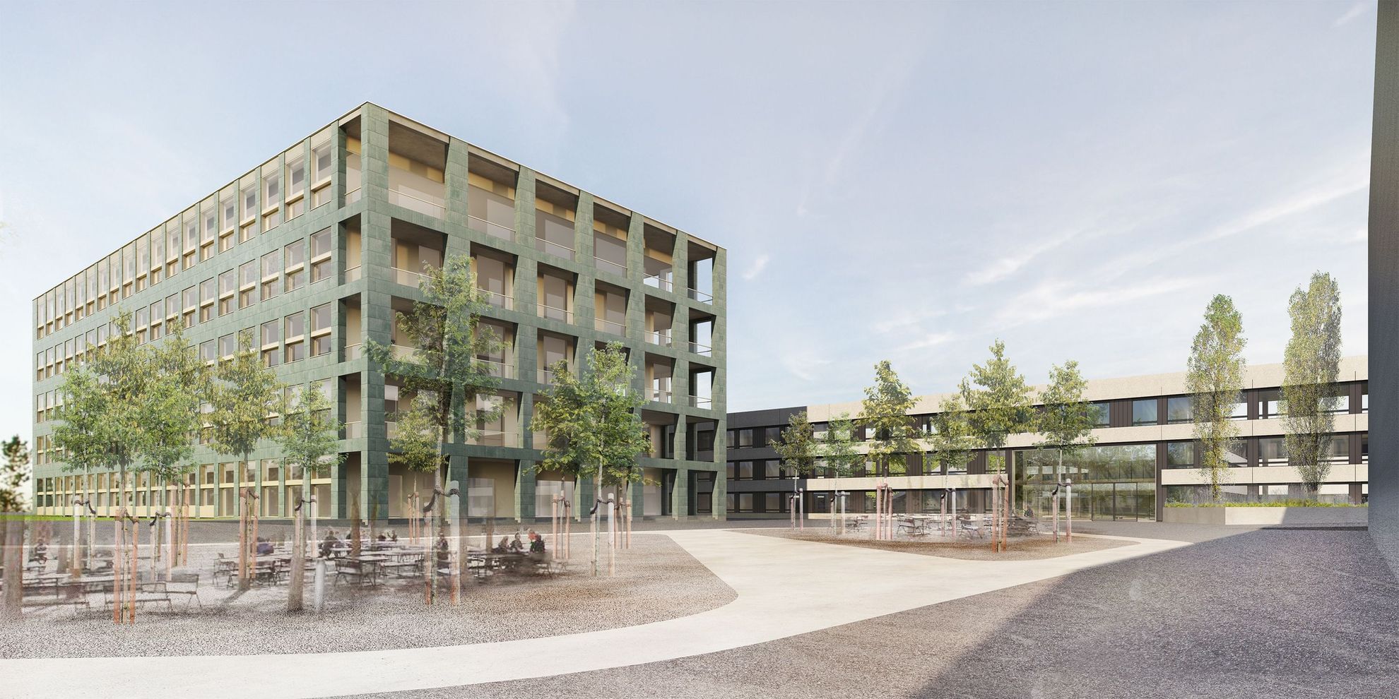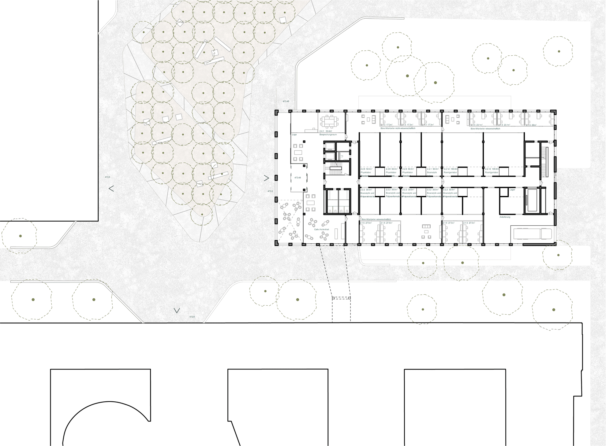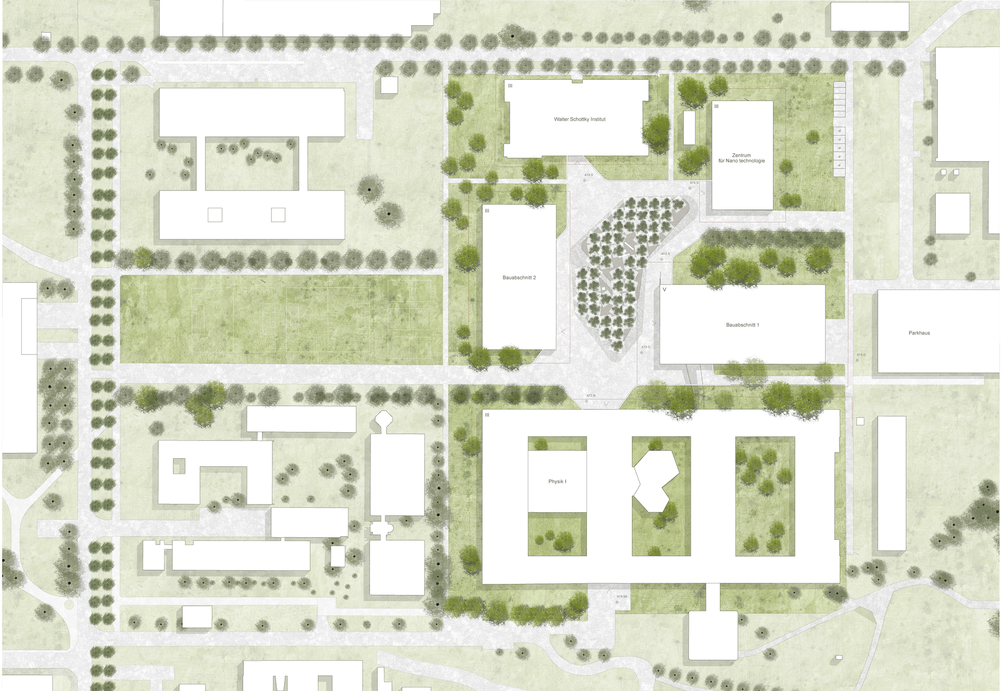 Topographisch vom umliegenden Terrain leicht abgesenkt werden alle bestehenden und neuen Gebäude ebenerdig erschlossen. Ein im Raster gepflanztes Platanenfeld füllt den Raum zwischen den einzelnen Institutsgebäuden. Dieses Raster bildet kein starres Gerüst, es reagiert auf die Eingänge und Nutzungen der Gebäude und rahmt Platz- und Aufenthaltsbereiche. Ein umlaufendes Betonband säumt das Feld und ist flexibel nutzbar für funktionale Anforderungen (z.Bsp. Fahrradstellplätze) oder Aufenthalts- und Spielelemente (Ping-Pong etc.)