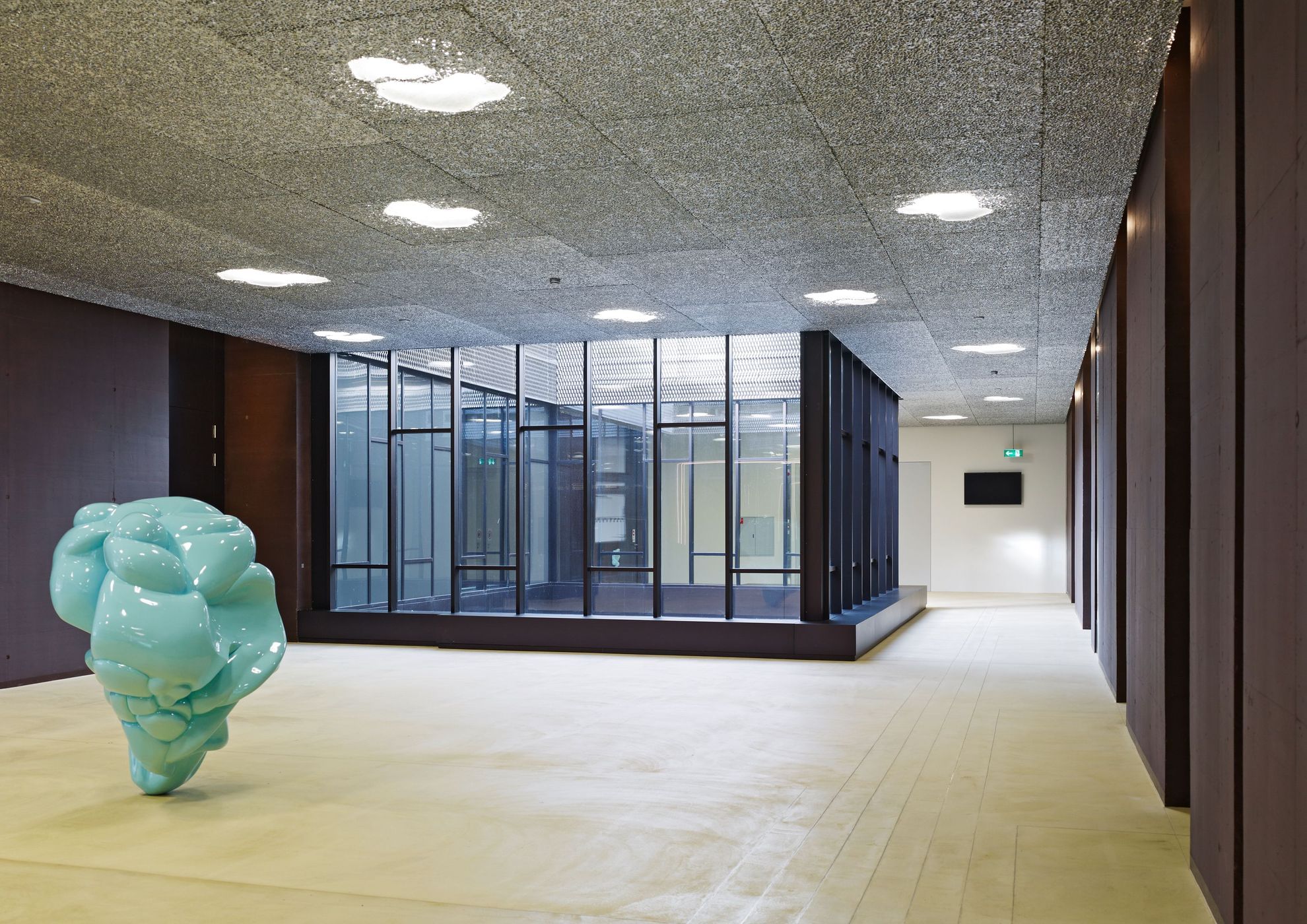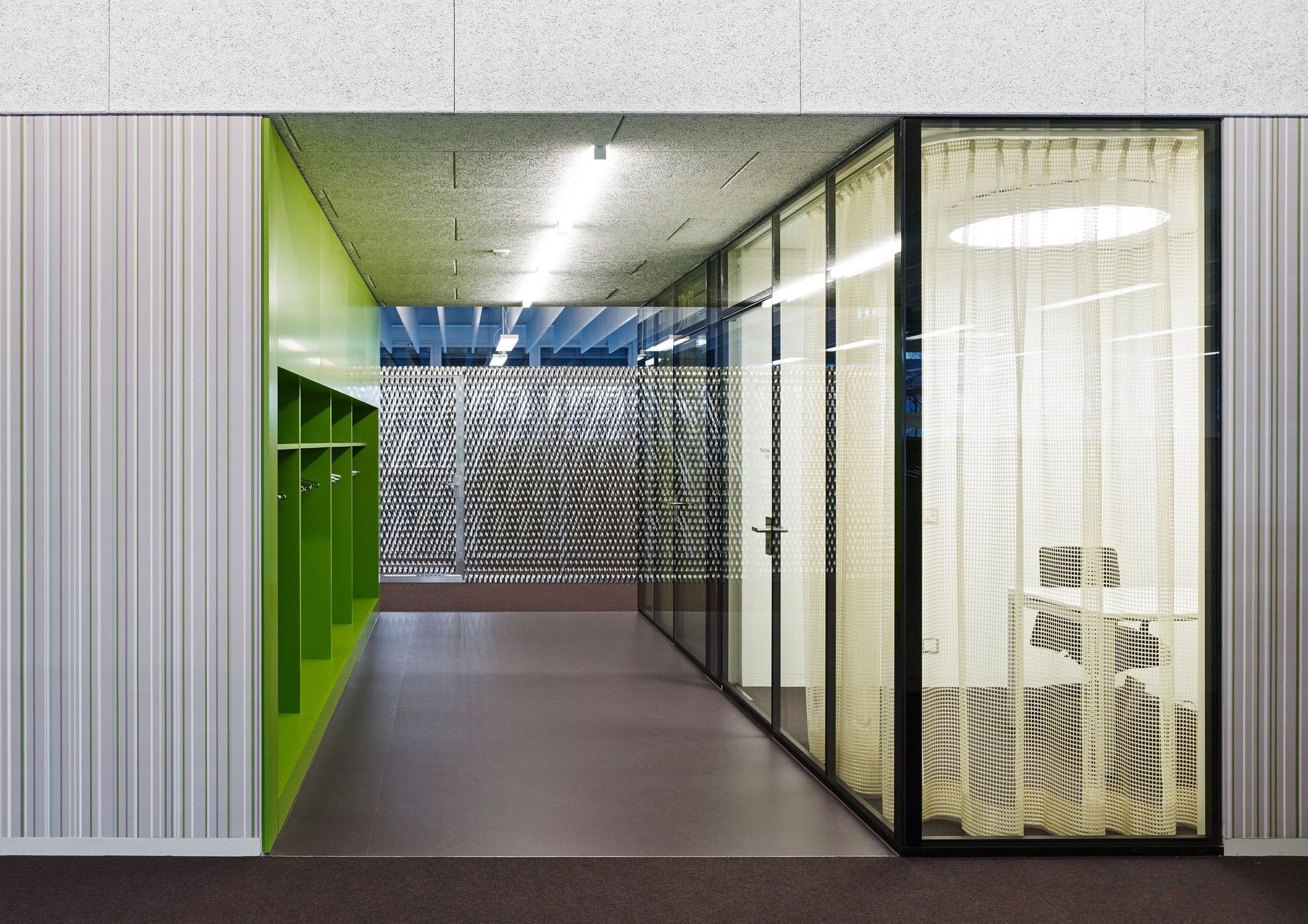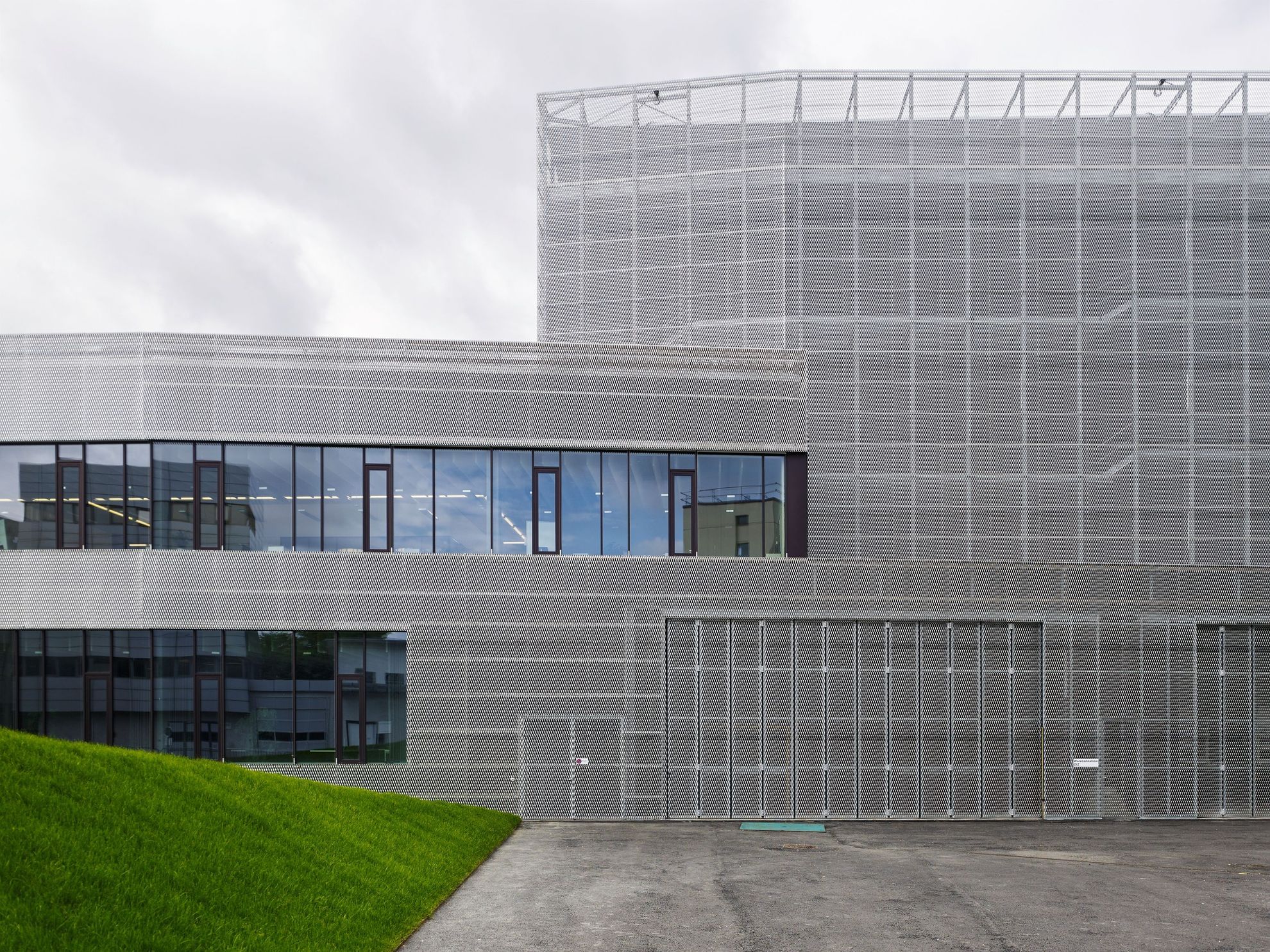 Der Neubau übernimmt die bestehenden Geschosshöhen mit weit gespannten Hohlkörperdecken. Die vertikale Tragstruktur aus U-förmigen Elementen wirkt raumbildend, indem sie die mittlere Zone des Foyers definiert. Ein grosszügiger Lichthof belichtet diese und verbindet die Geschosse visuell und räumlich. Die gesamte Baumasse wird mit übergreifenden, geknickten Flächen zu einem zusammenhängenden, plastisch wirkenden Volumen verbunden. Die Oberflächen der Fassaden sind umlaufend mit offenen Rohaluminium-Streckblechen versehen. Je nach Blickwinkel wird die dahinter liegende auberginefarbene Verkleidung der Dämmung sichtbar und lässt so das Volumen massiv oder leicht erscheinen. In den Innenräumen wurde die aus Gründen der nachhaltigen Anpassbarkeit geforderte Systemtrennung von Rohbau und Ausbau konsequent als Mittel der Gestaltung eingesetzt und sämtliche Installationen und Akustikmassnahmen sichtbar belassen. Die Architektur reagiert so auf die hohe technische Komplexität mit einer Strategie der konzeptuellen Einfachheit, die eine direkte ästhetische Wirkung erzeugt.