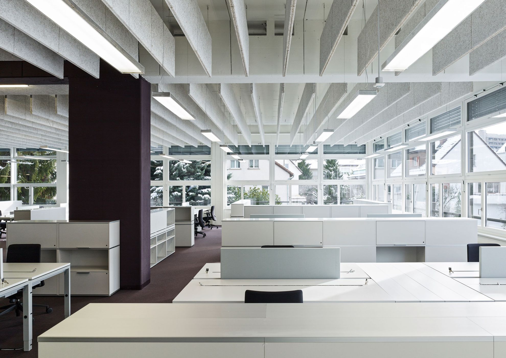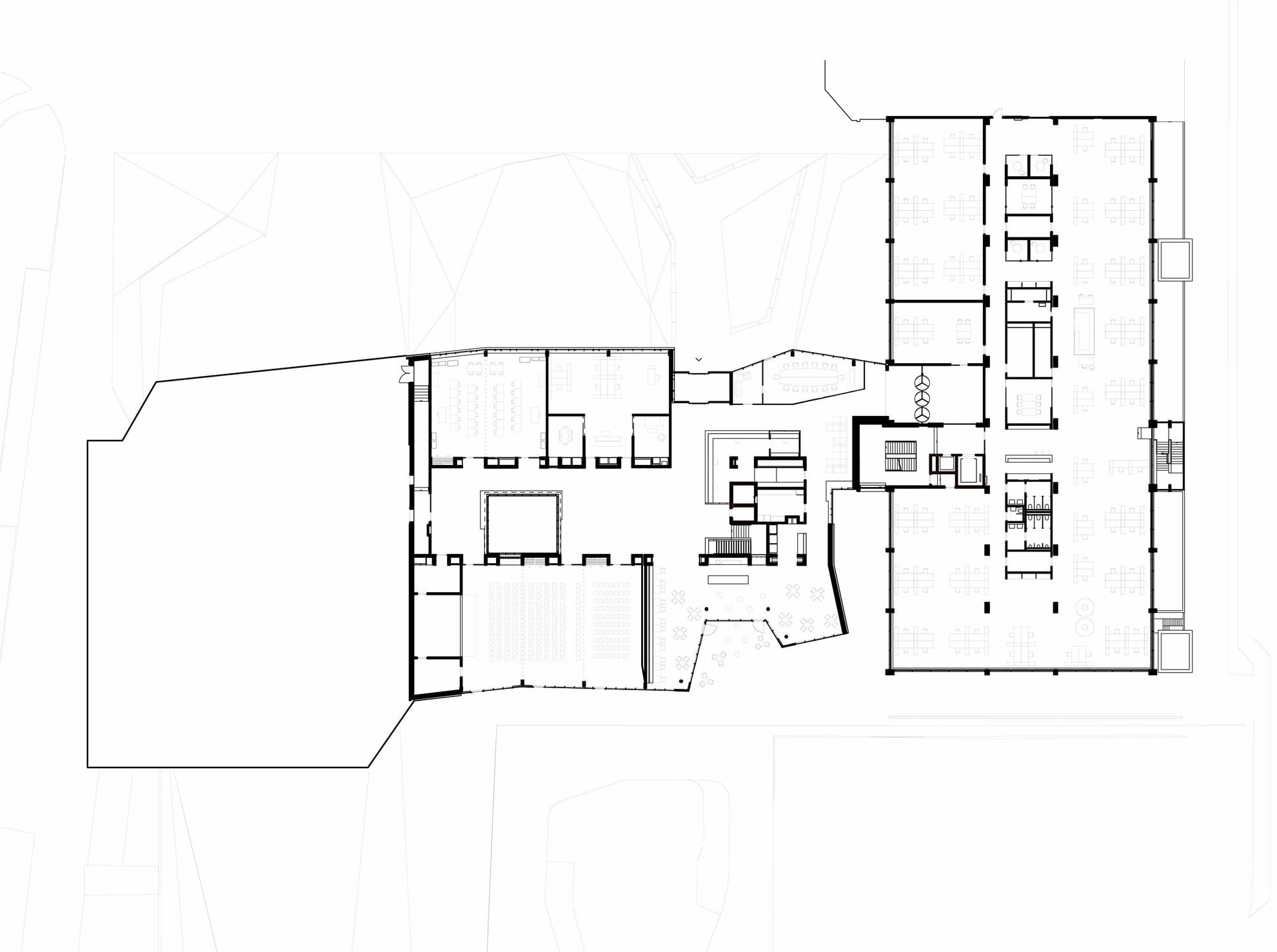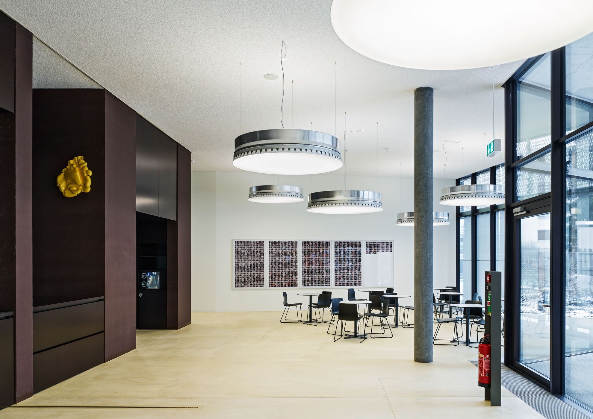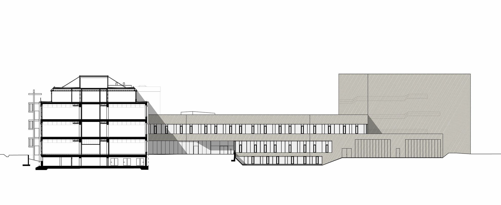 Der Neubau übernimmt die bestehenden Geschosshöhen mit weit gespannten Hohlkörperdecken. Die vertikale Tragstruktur aus U-förmigen Elementen wirkt raumbildend, indem sie die mittlere Zone des Foyers definiert. Ein grosszügiger Lichthof belichtet diese und verbindet die Geschosse visuell und räumlich. Die gesamte Baumasse wird mit übergreifenden, geknickten Flächen zu einem zusammenhängenden, plastisch wirkenden Volumen verbunden. Die Oberflächen der Fassaden sind umlaufend mit offenen Rohaluminium-Streckblechen versehen. Je nach Blickwinkel wird die dahinter liegende auberginefarbene Verkleidung der Dämmung sichtbar und lässt so das Volumen massiv oder leicht erscheinen. In den Innenräumen wurde die aus Gründen der nachhaltigen Anpassbarkeit geforderte Systemtrennung von Rohbau und Ausbau konsequent als Mittel der Gestaltung eingesetzt und sämtliche Installationen und Akustikmassnahmen sichtbar belassen. Die Architektur reagiert so auf die hohe technische Komplexität mit einer Strategie der konzeptuellen Einfachheit, die eine direkte ästhetische Wirkung erzeugt.