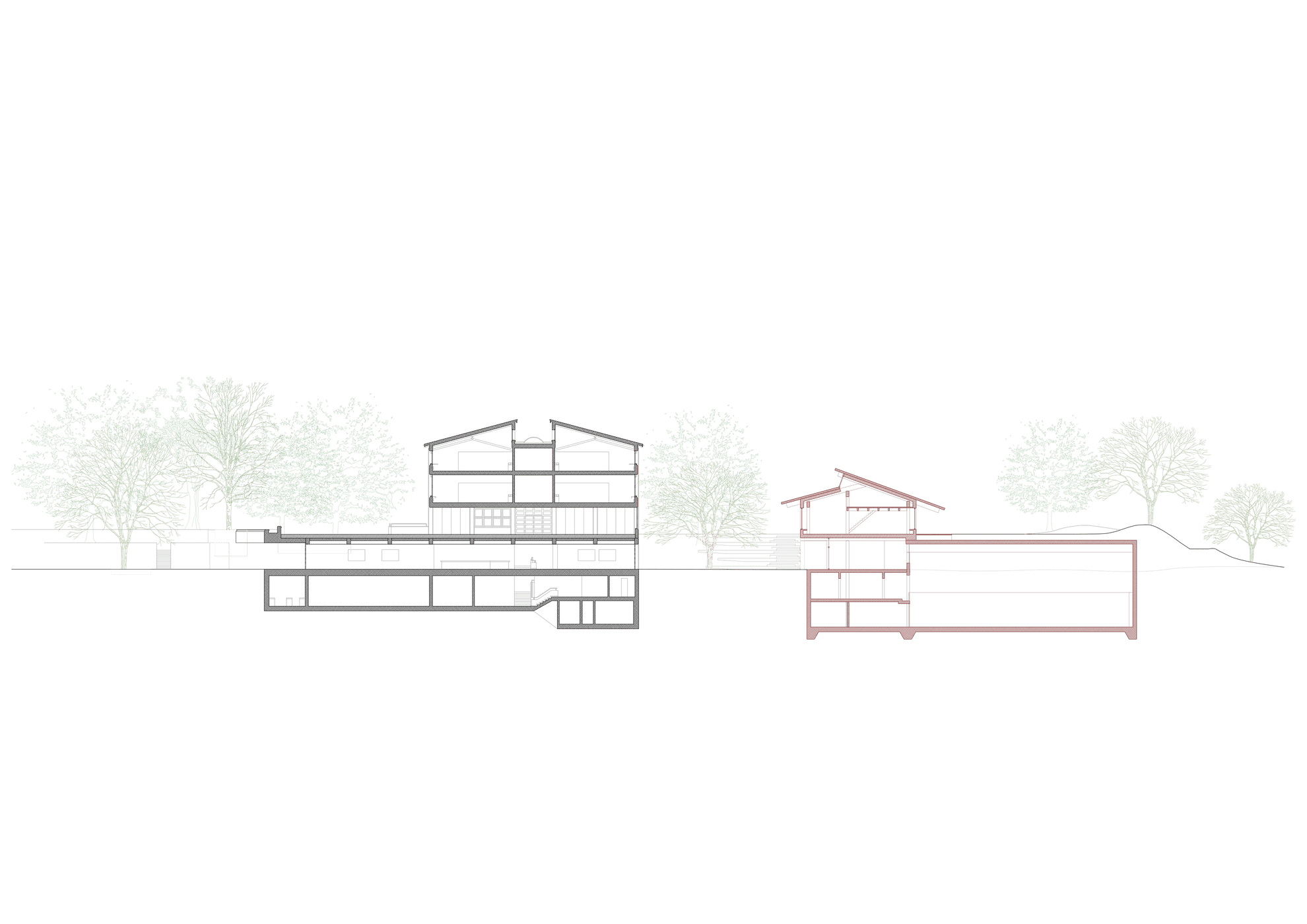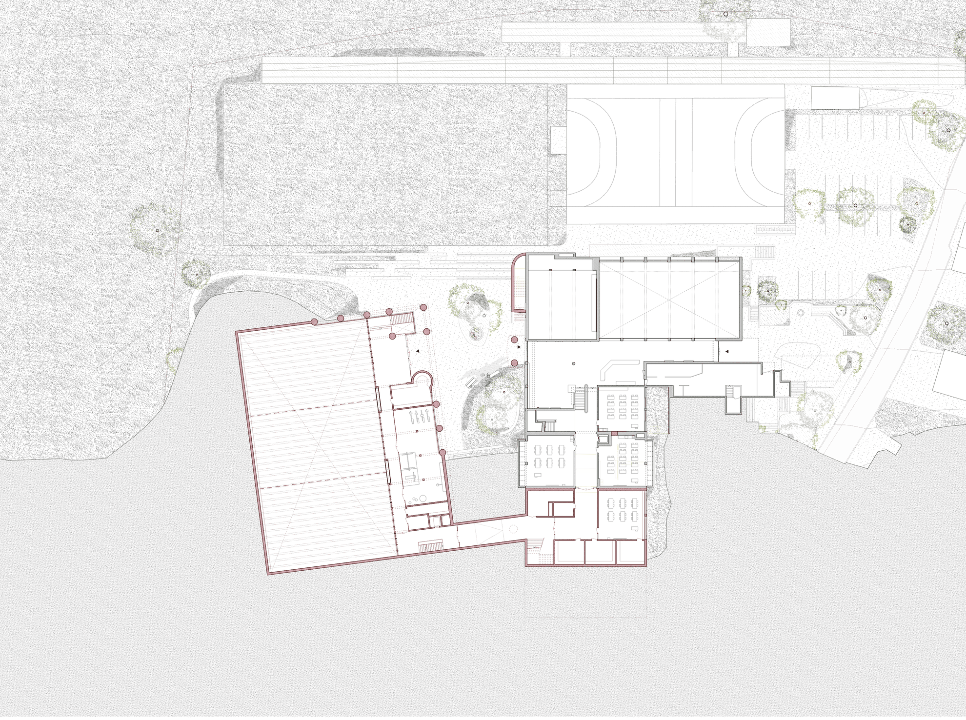 Die bisherigen öffentlich zugänglichen Nutzungen sind vom Foyer des Mehrzwecksaals über den neuen Aussenhof direkt und à-niveau mit dem Foyer der Sporthalle verbunden. So entsteht aus den beiden Bereichen eine Gesamtanlage mit einfacher Orientierung und nützlichen Synergien für Infrastruktur und die grossen Räume.
