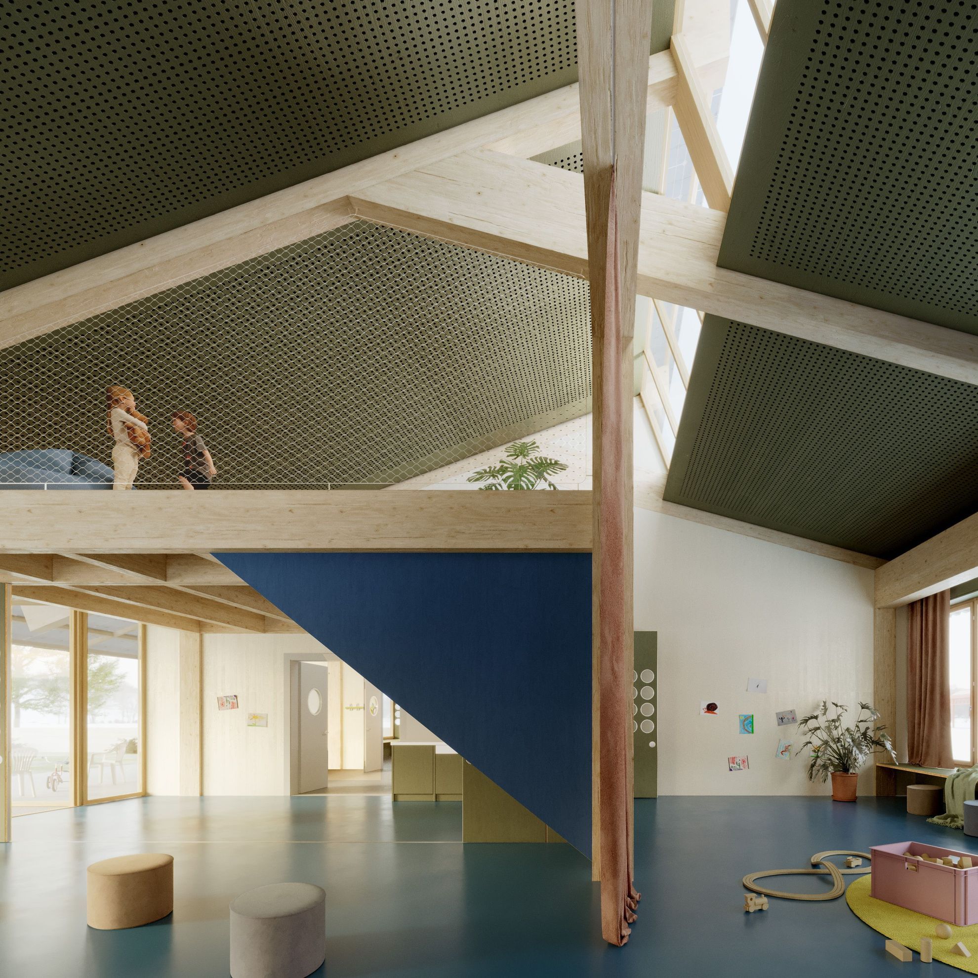 Über dem seitlichen Bereich der Nebenräume der Halle liegt das Kindergartengebäude, das sich als eigenständige Architektur zeigt. Die gedeckte Erschliessung erfolgt im Westen, im Kontakt mit den zugeordneten Aussenbereichen.