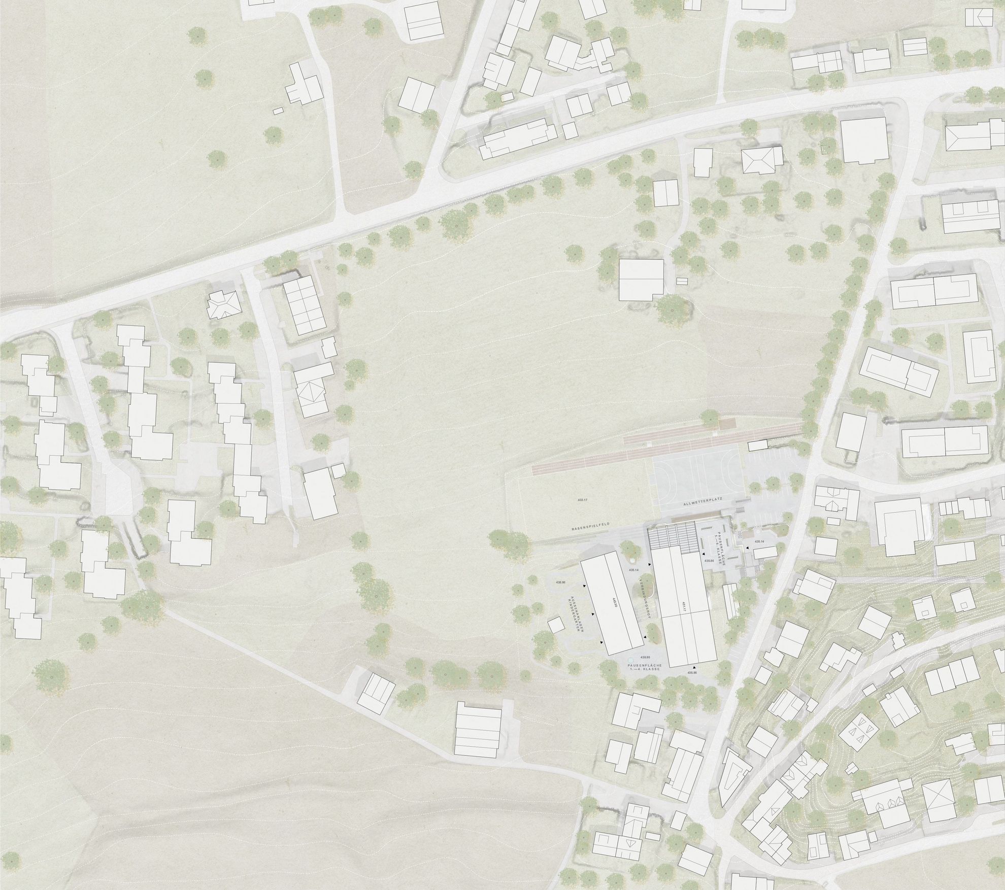 Die bestehende Schulanlage liegt am Rande einer offenen Landschaftskammer und profitiert von ihrer ausgesprochen schönen Lage am Hang, wobei der Sockelbau recht hoch erscheint und gegen Westen eine etwas schroffe Ecke bildet. Mit der Erweiterung mit unterschiedlichen Gebäuden und der Weiterführung des Sockelmotivs gelingt eine harmonische Einbettung in die sanfte Topografie hin zu einer Gesamtwirkung als Ensemble.