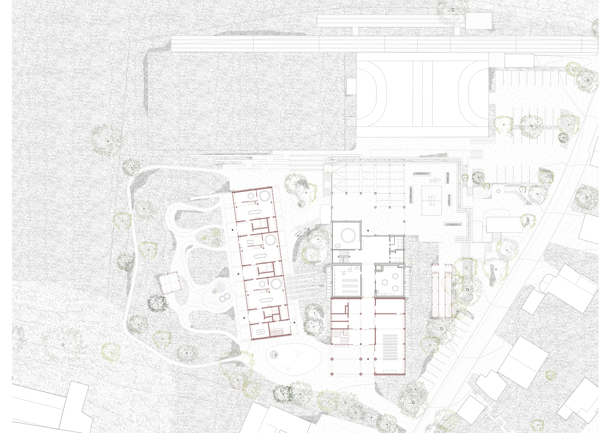 Die bestehende Gebäudefigur und die Ergänzung der Schulnutzung um weitere Klassenzimmer und Zusatzräume sind der Anlass, das Schulgebäude zu erweitern, zu verlängern und damit quasi fertig zu bauen. Die Schule erhält so zwei unabhängige Zugänge und Nutzungseinheiten für die beiden Klassenalter wie sie gewünscht sind, bleibt in der linearen Disposition jedoch zusammenhängend und offen für künftige Zuordnungen der Zimmer.