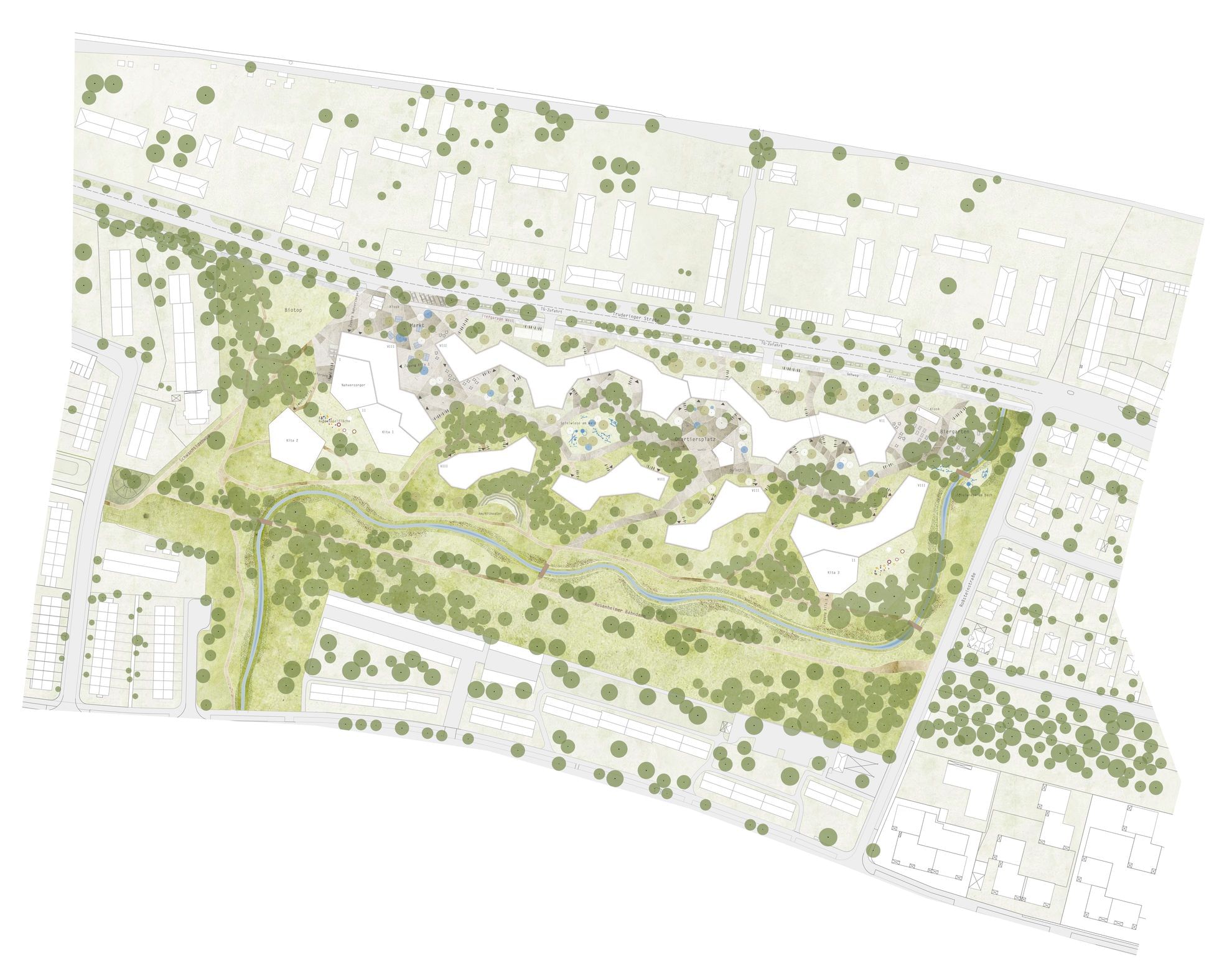 Am Ortsrand von Trudering im Übergang nach Berg am Laim gelegen ist das Grundstück heute eingebettet in verschiedene Landschaftselemente: Im Süden vom linearen Grünraum des ehemaligen Bahntrassees sowie dem künftigen Bachlauf, der auch den Freiraum nach Osten bilden wird, im Westen von der grünen Nord-Süd-Verbindung, die in einem Biotop ihren Abschluss findet.