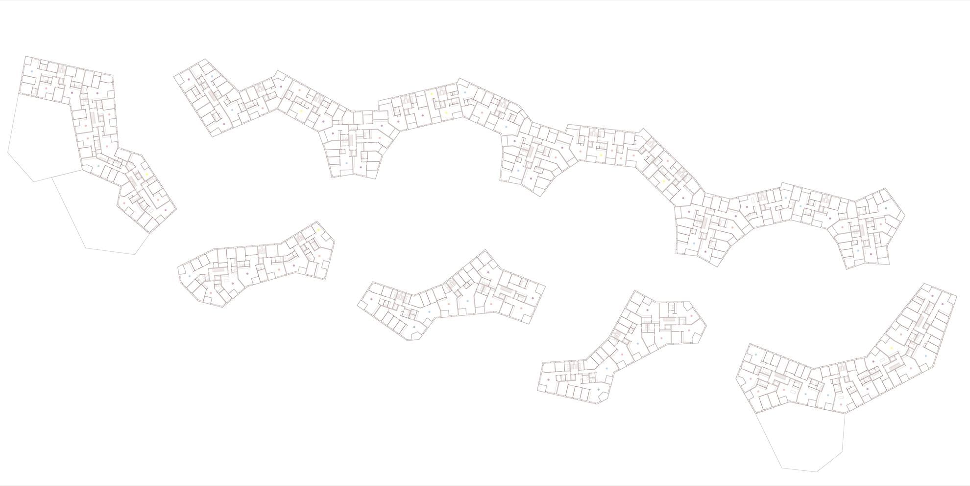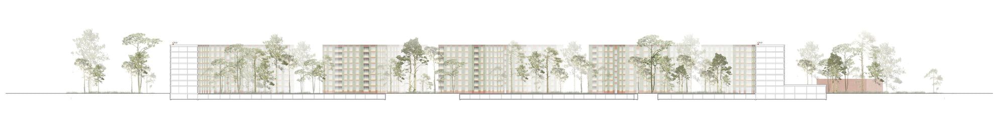 Die Fassung dieser inneren Räume erfolgt im Prinzip mit einer Grossform, die über die organische Strukturierung jedoch nicht linear und starr erscheint. In der Wahrnehmung von der Strasse wird sie als Abfolge von vor- und zurückliegenden Gebäudeteilen hinter Bäumen erscheinen. Im südlichen Bereich ist die Gesamtform in einzelne Gebäude aufgegliedert , die die inneren Räume begrenzen und diese gleichzeitig nach Süden offen lassen.