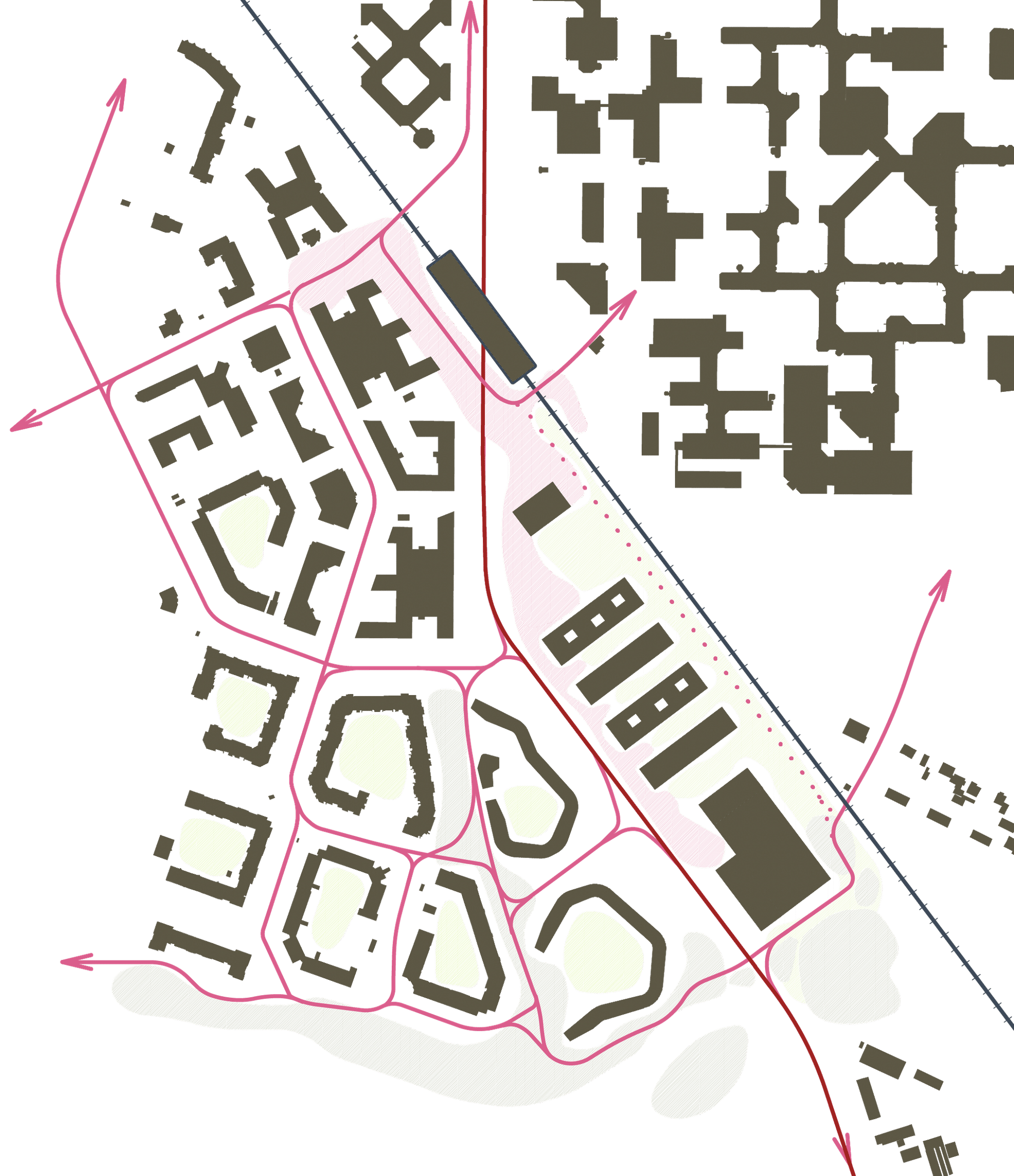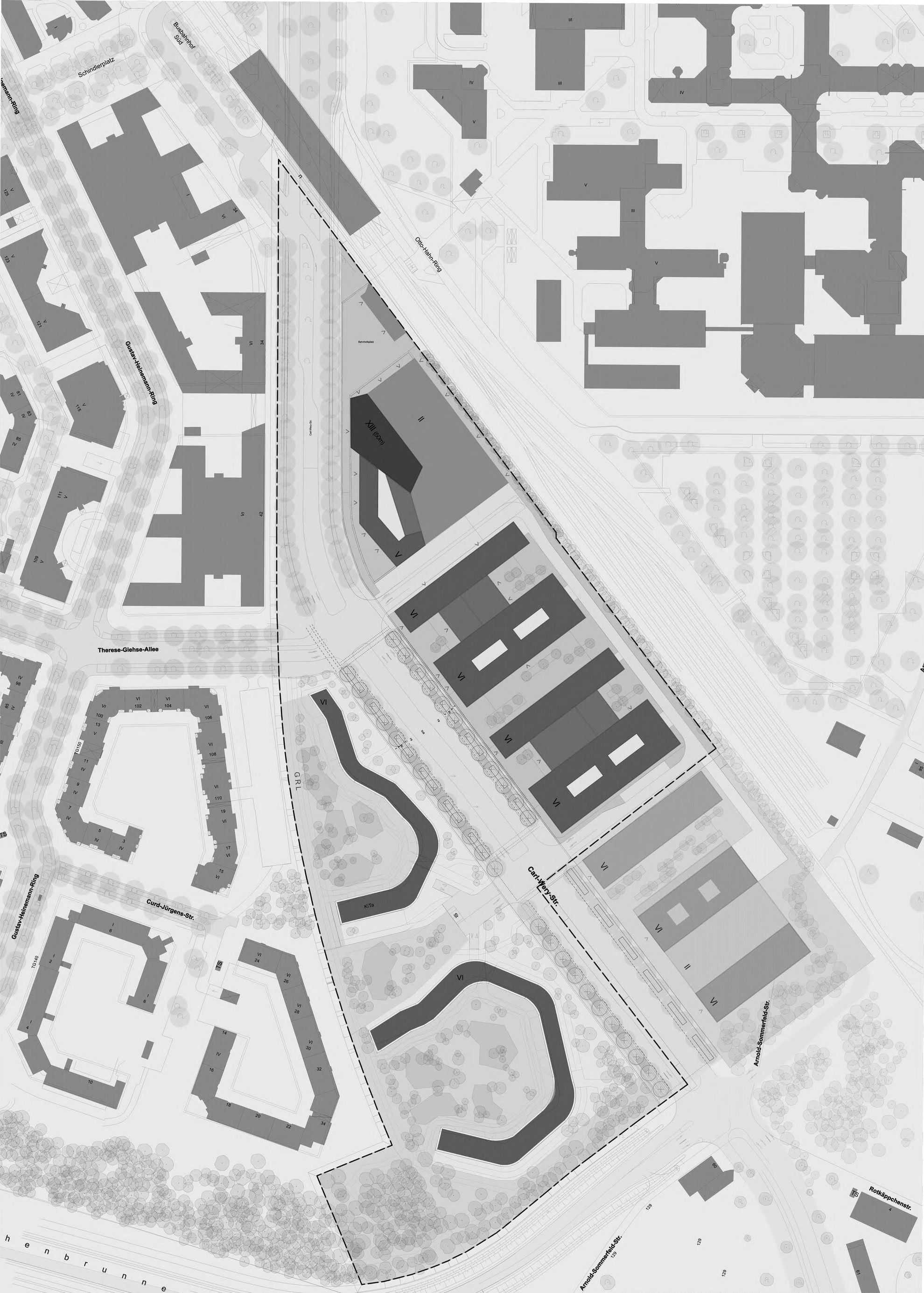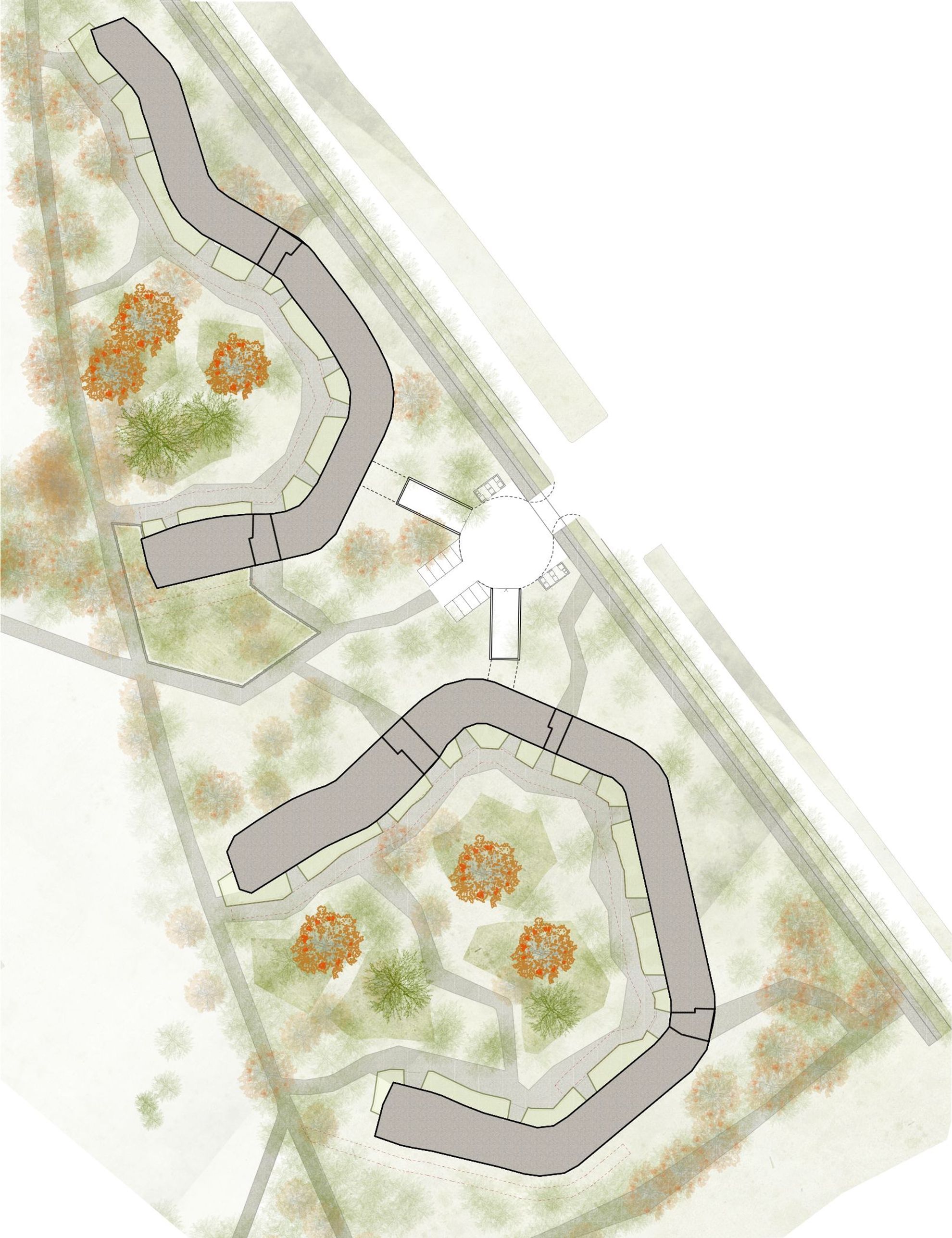 Die Lage der beiden Gebäude am Rand des Wohngebietes verlangt eine sorgfältige Anbindung und Vernetzung der Wege. Die gebogenen Volumen bewirken in der Wahrnehmung eine angenehme Fragmentierung, indem immer nur ein Teil der gesamten Anlage sichtbar ist. Aus der Distanz liegen die Volumen elegant hinter den Bäumen, angenehme Proportionen und leichter Glanz auf der Fassade ergeben eine freundliche Ausstrahlung trotz der grossen Dimensionen.