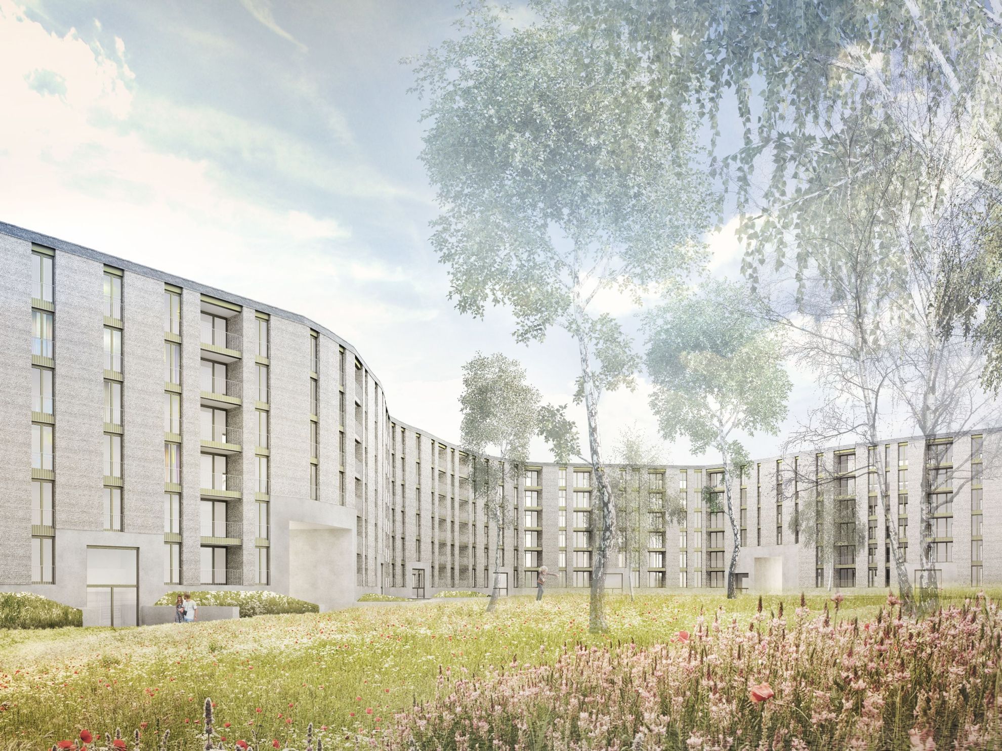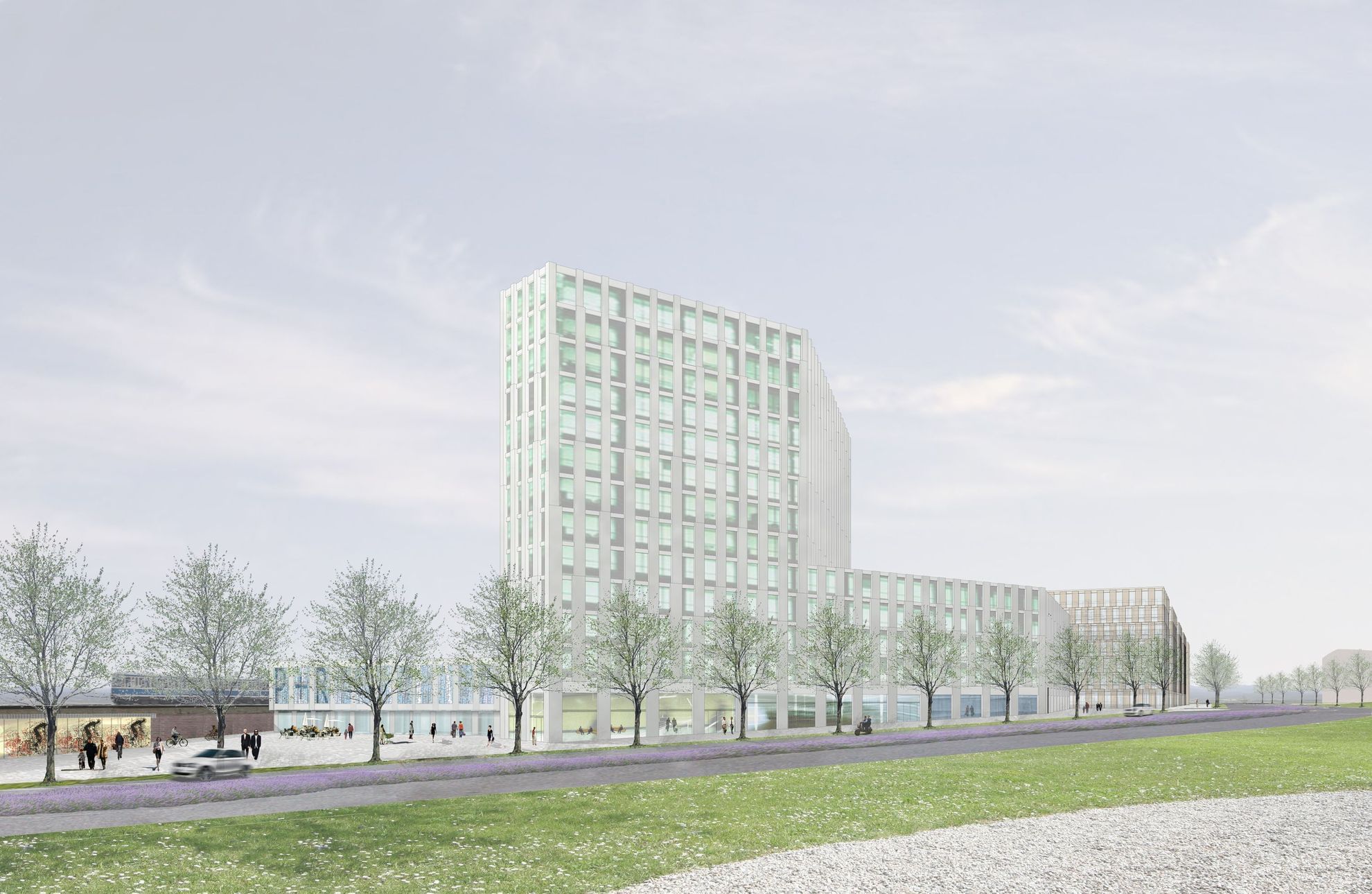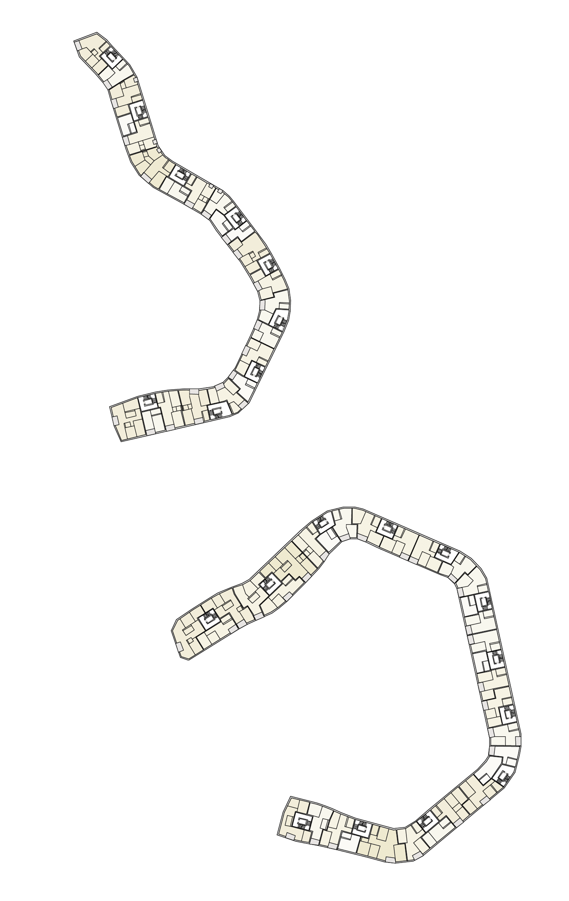 Die Lage der beiden Gebäude am Rand des Wohngebietes verlangt eine sorgfältige Anbindung und Vernetzung der Wege. Die gebogenen Volumen bewirken in der Wahrnehmung eine angenehme Fragmentierung, indem immer nur ein Teil der gesamten Anlage sichtbar ist. Aus der Distanz liegen die Volumen elegant hinter den Bäumen, angenehme Proportionen und leichter Glanz auf der Fassade ergeben eine freundliche Ausstrahlung trotz der grossen Dimensionen.
