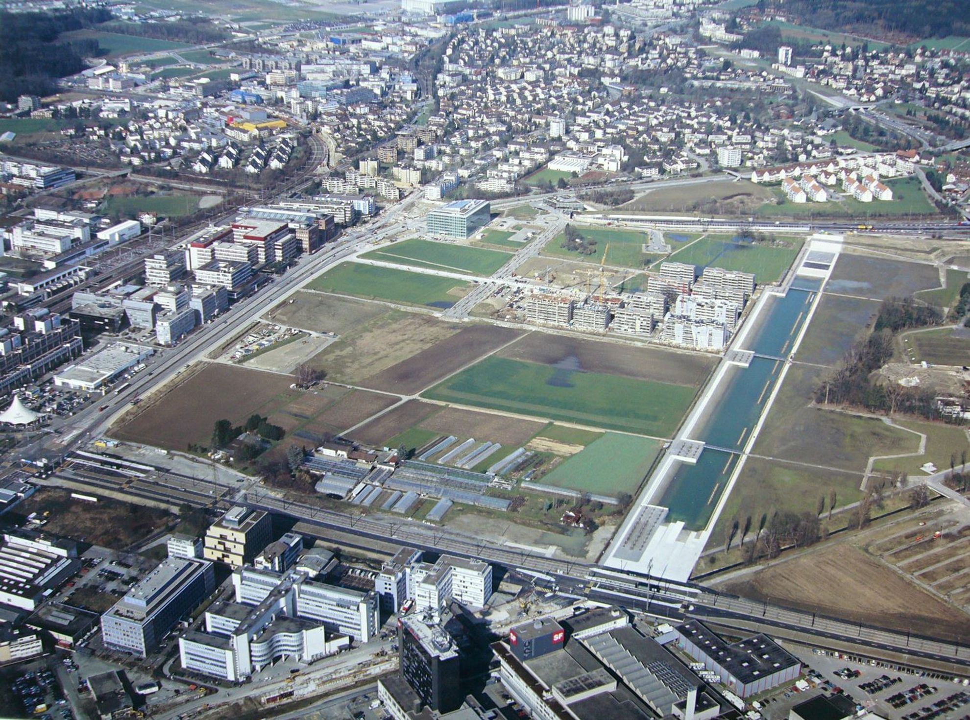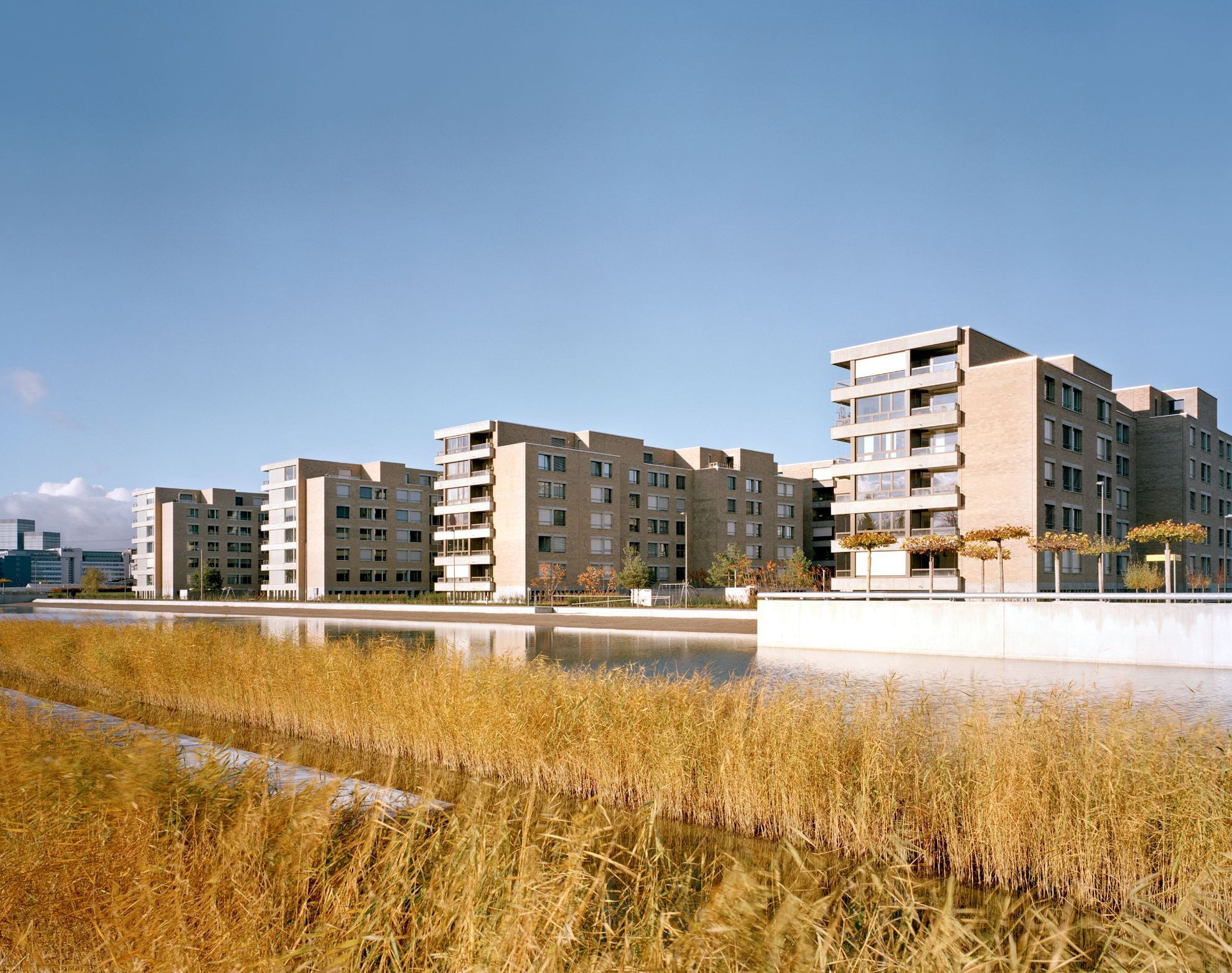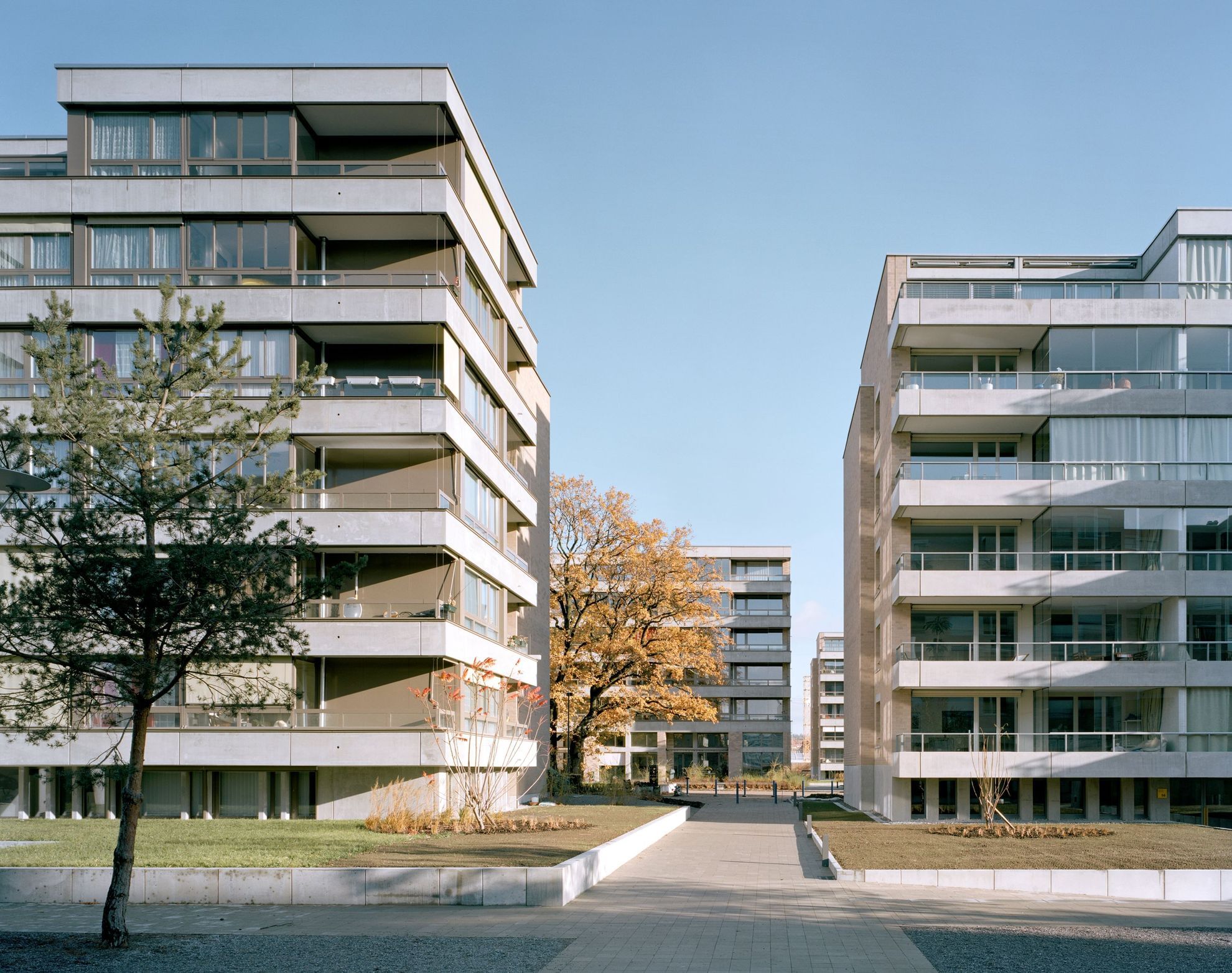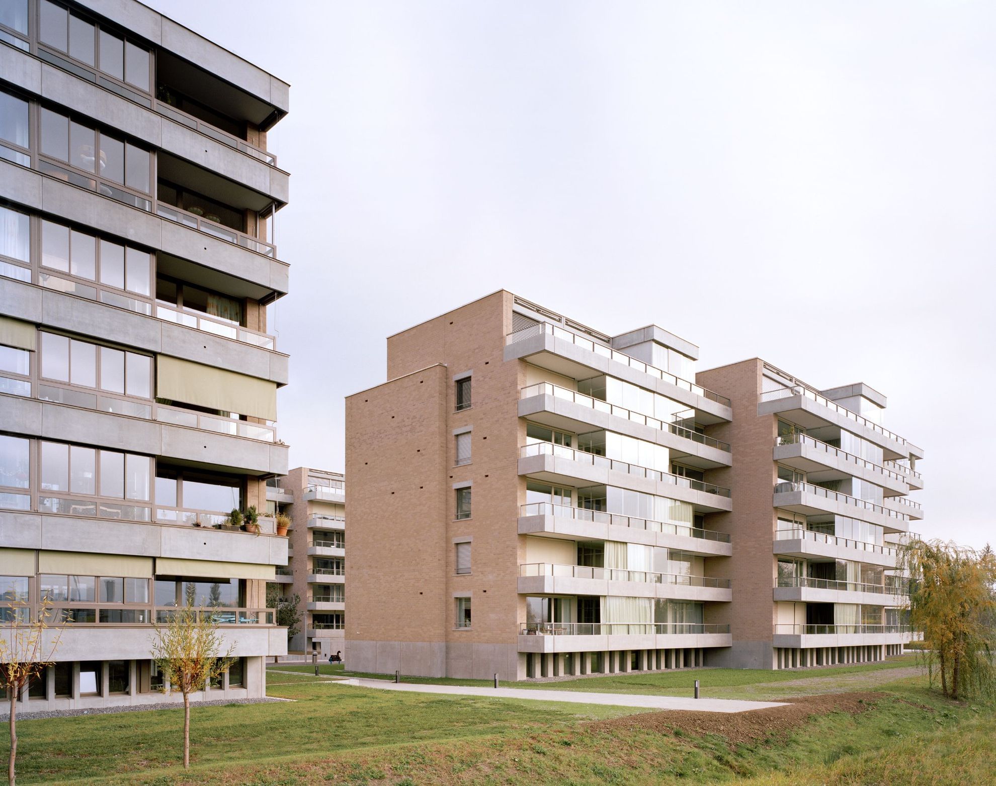 Die acht Wohnblöcke mit 200 Wohnungen, die mit unterschiedlichen Generalunternehmern realisiert wurden, sind Teil einer Grossplanung für das Oberhauserriet in Opfikon. In ihrer Ausrichtung beziehen sich die Bauten auf die Lage am See, dessen Präsenz bis weit in die Zwischenräume spürbar bleibt. Kombiniert mit der Öffnung zur Sonne, zeigen die Gebäude zwei unterschiedliche Ausprägungen: eine offene, horizontal gegliederte Wohnseite mit Balkonen und Wintergärten, dieser entgegen eine murale Seite mit grossen Fenstern für die Schlafräume.