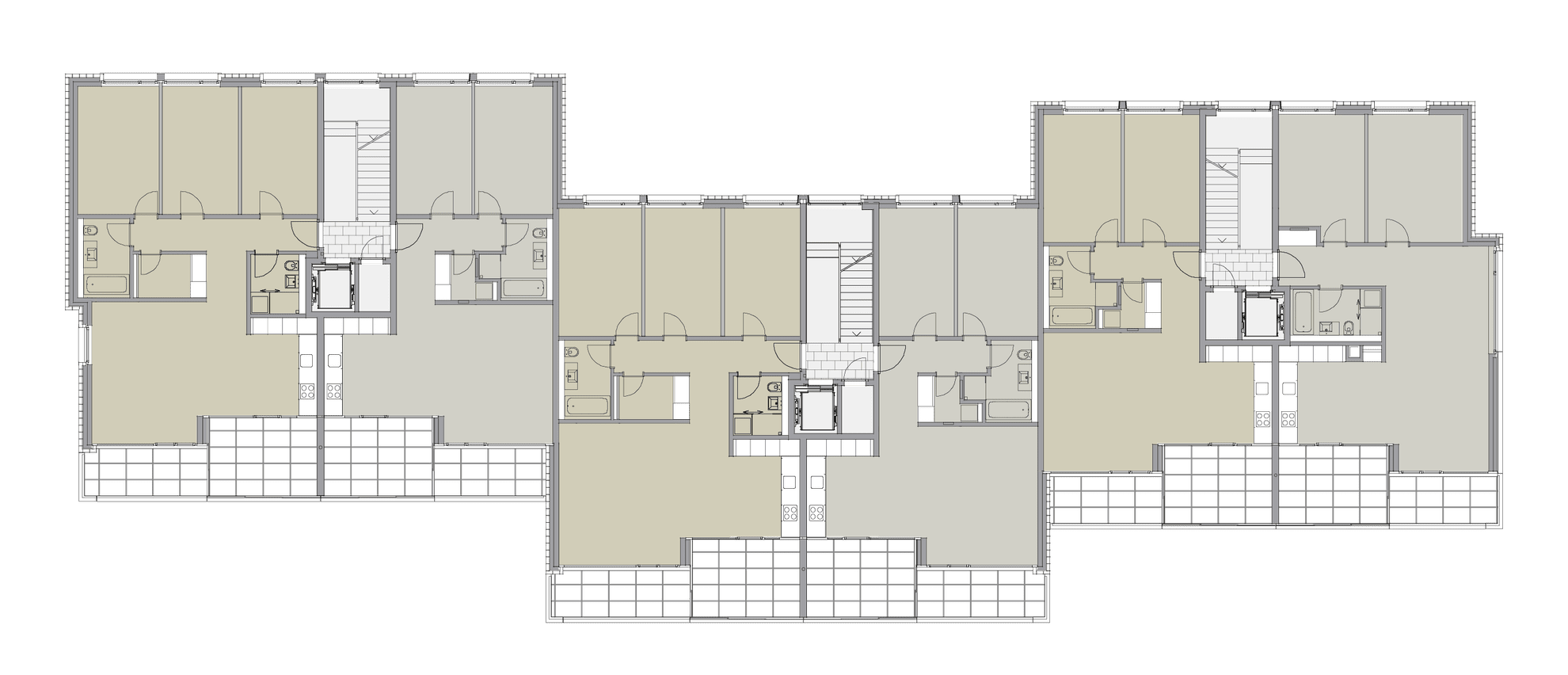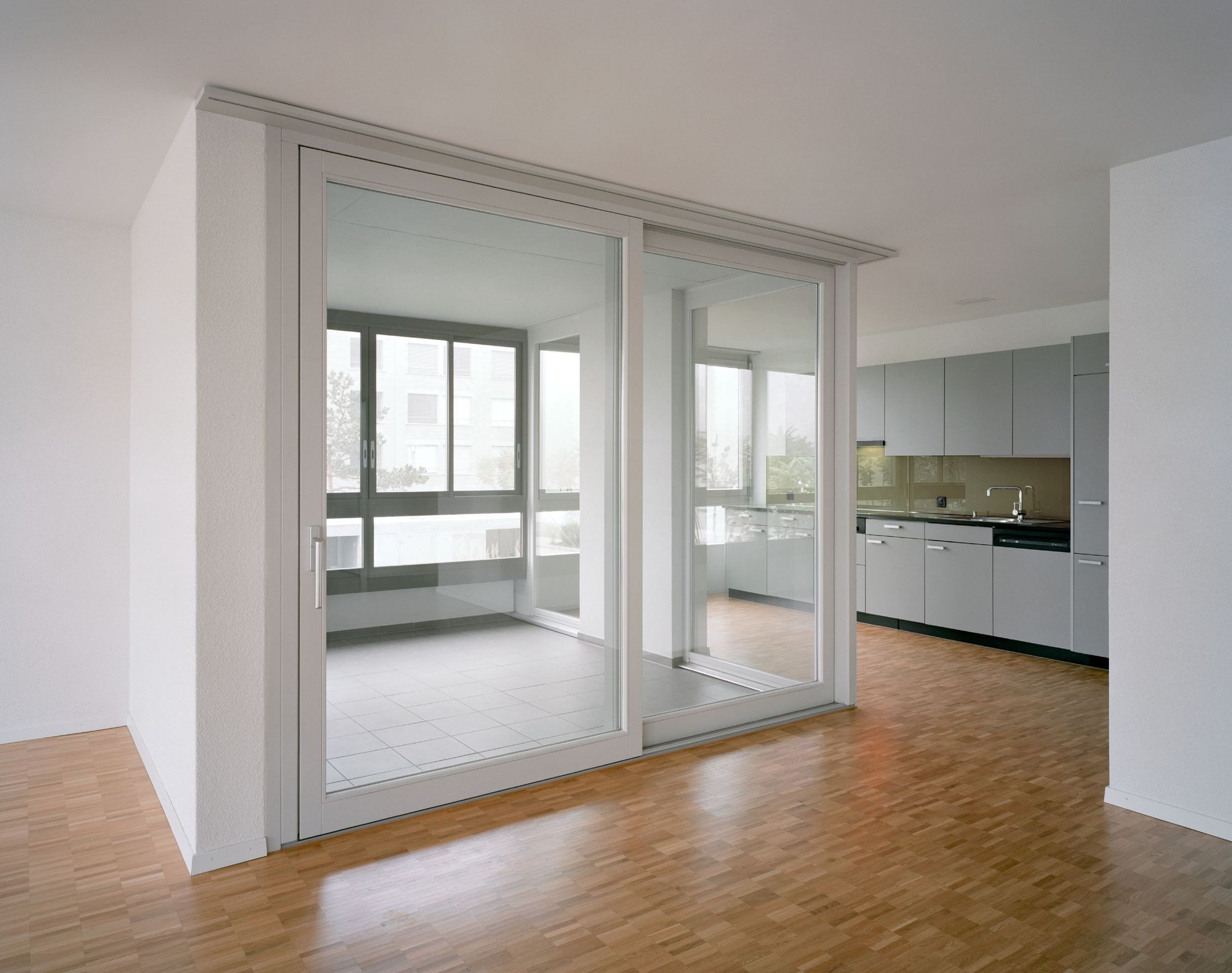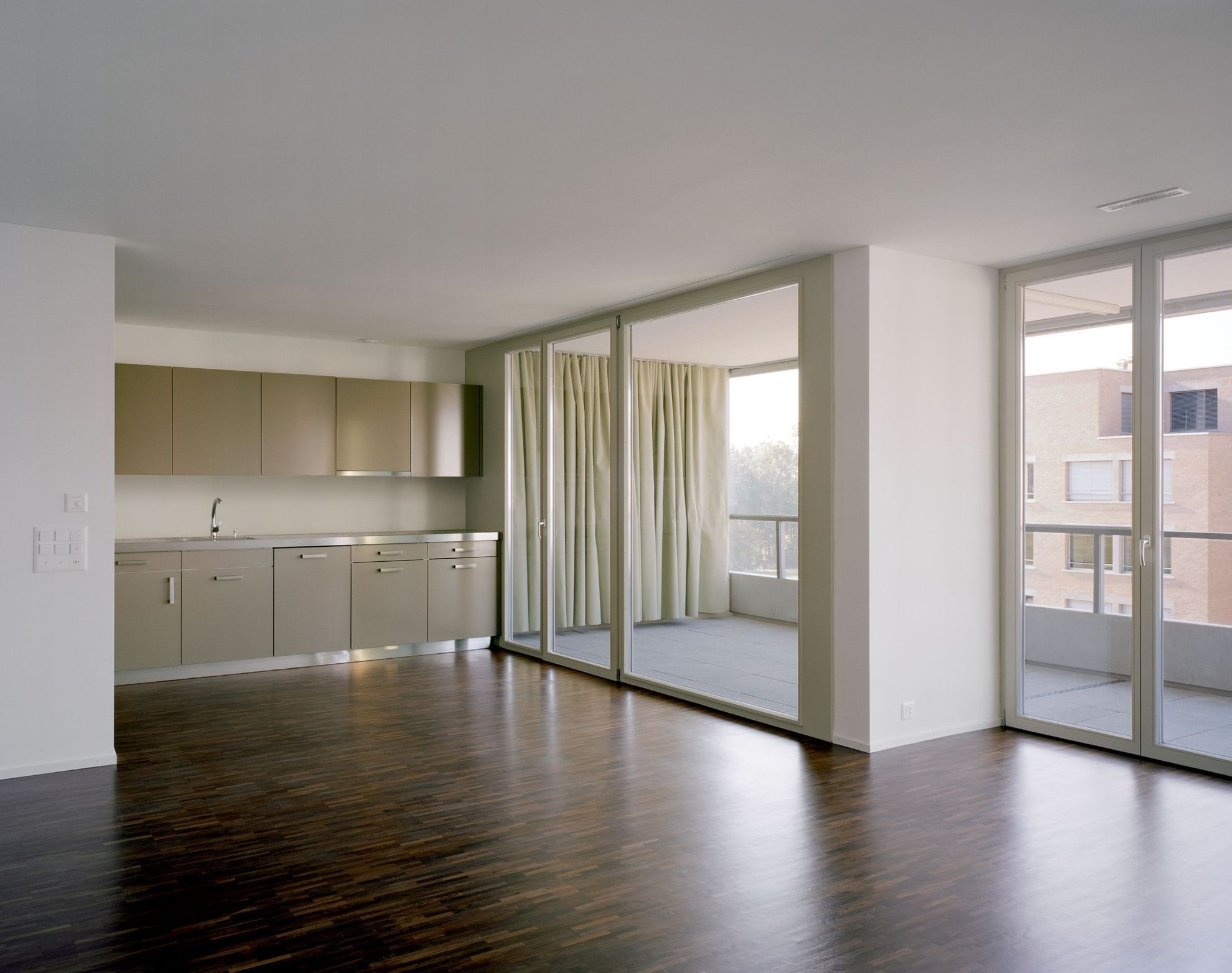 Hauptelement der Wohnungen bildet der großzügige Wohn-Essraum, der mit einer direkten Verschränkung von Innen und Aussen eine vielfältig nutzbare, leicht gegliederte Raumabwicklung entstehen lässt. Die sorgfältig gewählten und durchgängig eingesetzten Materialien sorgen fuhr einen gepflegten, leicht edlen Ausdruck.