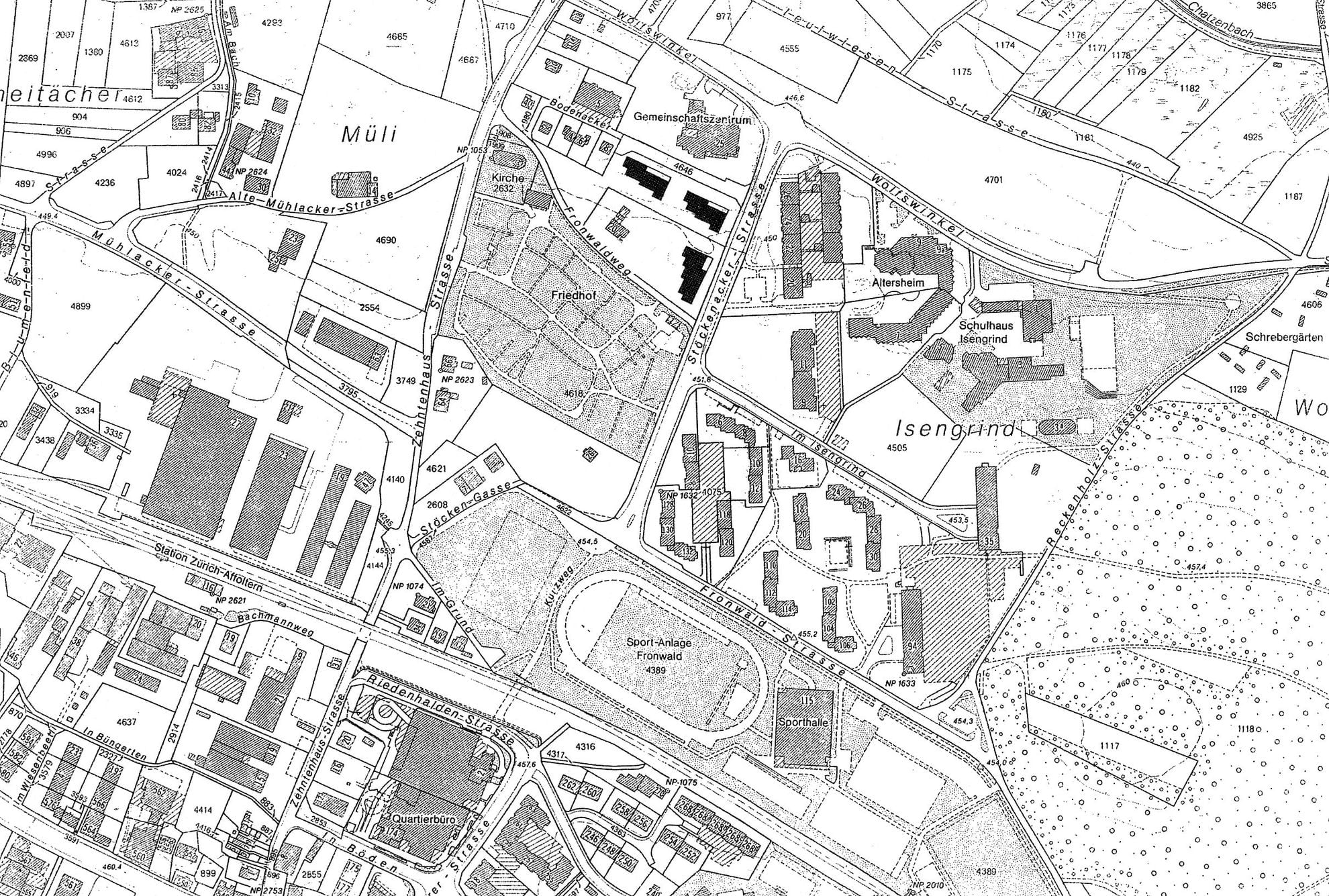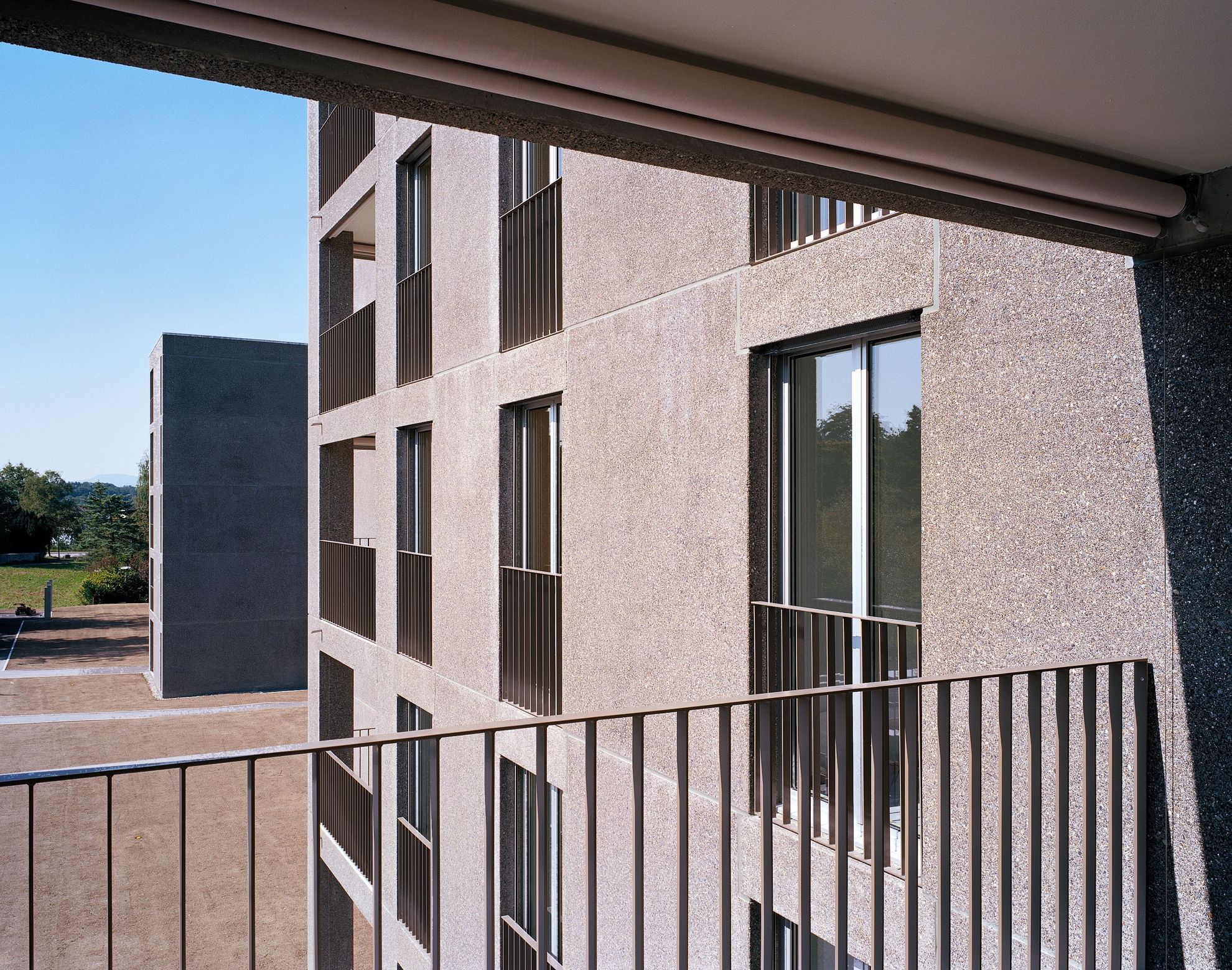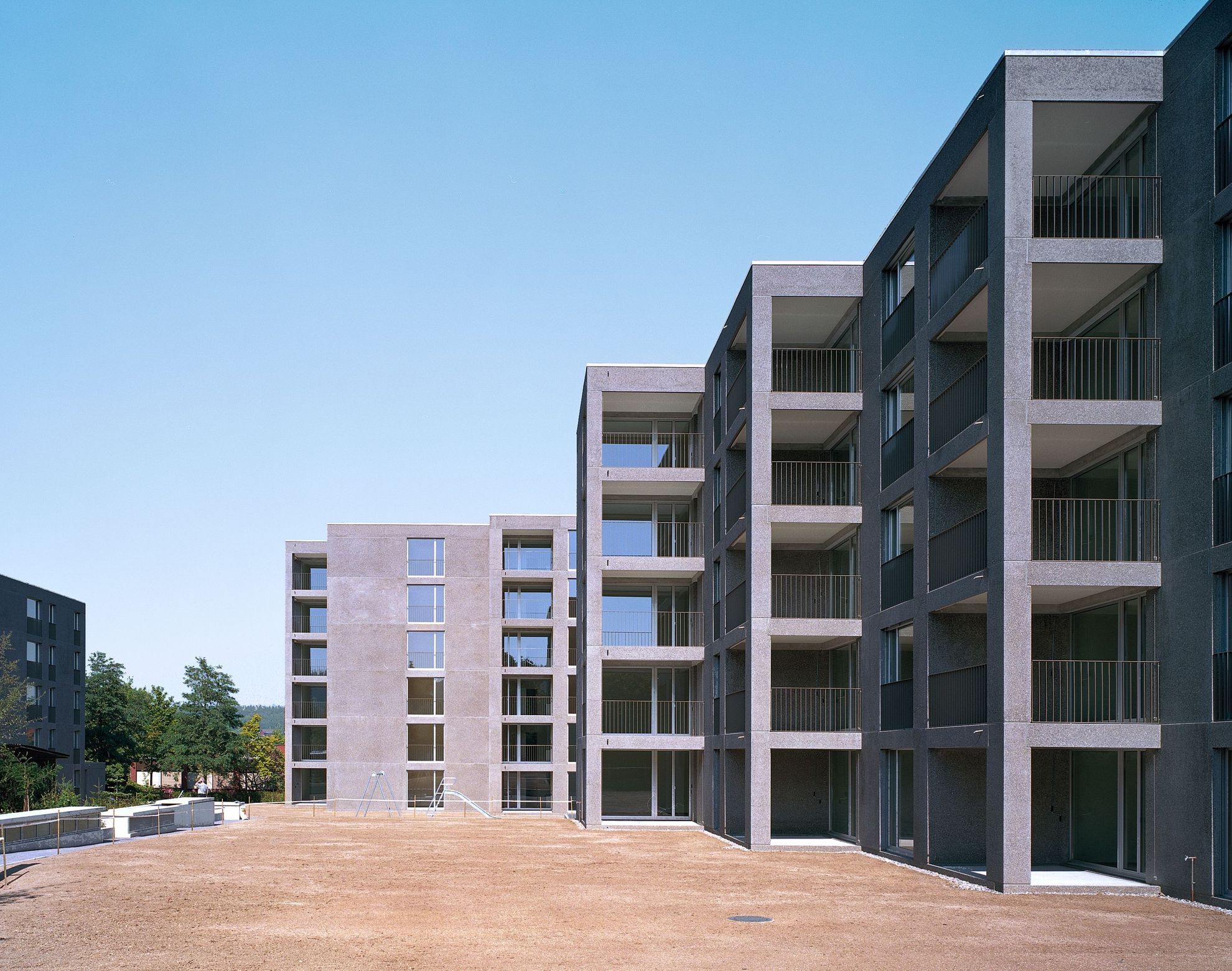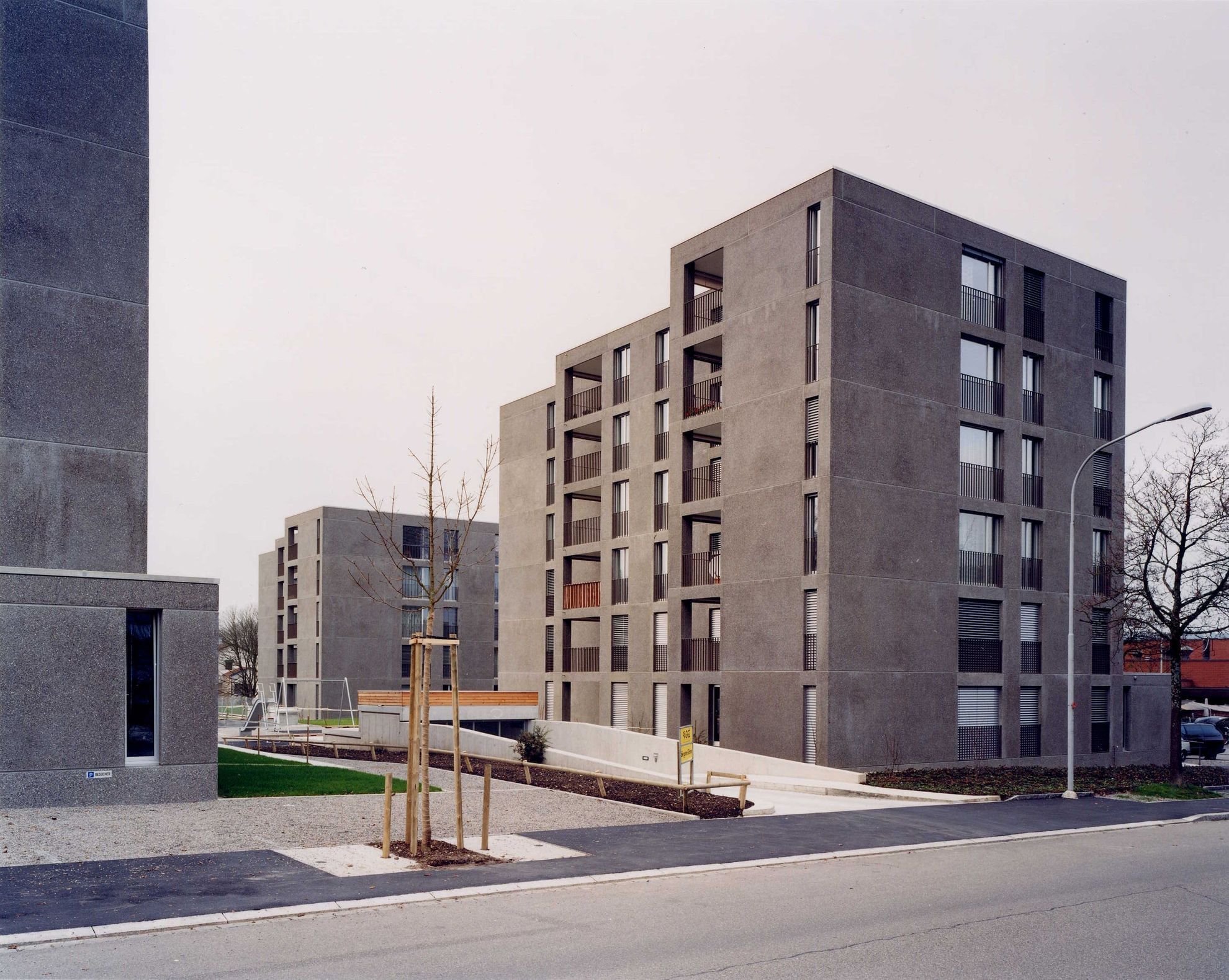 Die Bebauung nimmt grossräumig Bezug auf die umliegenden Wohnsiedlungen, den Grünraum und die Weite des Tales. In einem räumlich und städtebaulich unterdeterminierten Gebiet werden über die Konstellation der Volumen und Gebäudefluchten wirksame Bindungen geschaffen und eine urbane Grundhaltung etabliert. Die unterschiedliche Konturierung von Strassen- und Gartenseite erlaubt spezifische Reaktionen; Linearität und eine gewisse Härte zur Strasse, wo die artikulierten Zugänge zu den Häusern liegen, zum Grünraum hin eine bewegte Gliederung und Offenheit, die von der Ausrichtung der privaten Terrassen bestimmt wird.