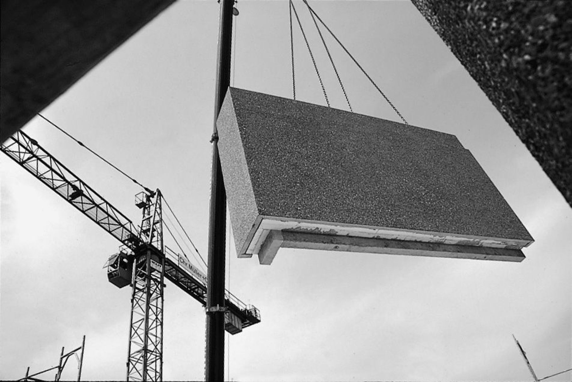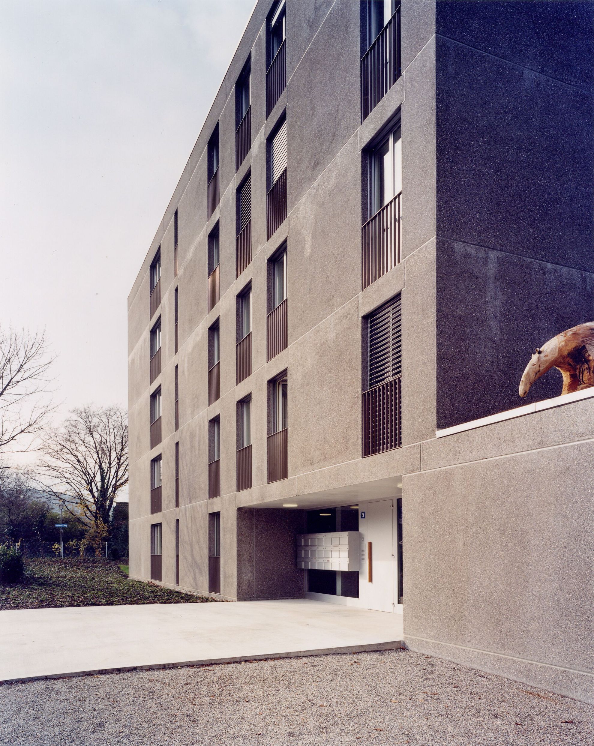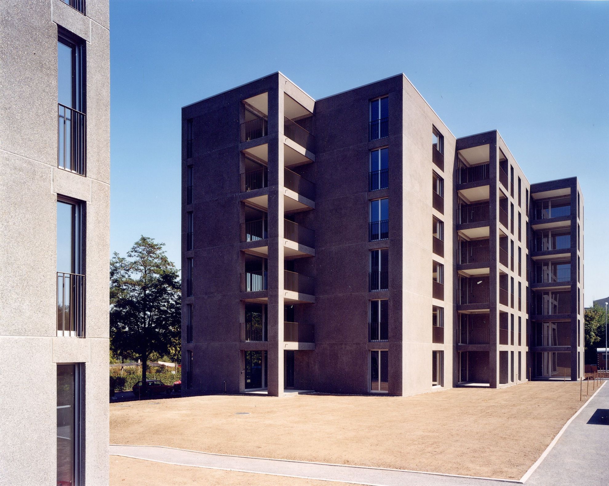 Prägendes Merkmal der Gebäude sind die Aussenwände, die aus dreischichtigen, leicht gewaschenen Betonsandwichelementen bestehen. Neben der guten Alterungsfähigkeit und Langlebigkeit ermöglicht die Anwendung der ‚Schweren Vorfabrikation‘, dieser in den sechziger Jahren verbreiteten Bauweise, lokale Bezüge, verfolgt aber weitergehende Ziele: Urbane Einbindung, Erzeugung von Identität und Charakter bei einem hohen Grad an Neutralität und die entwerferische Aktualisierung einer technisch bewährten Bauweise durch gezielte Modifikationen einzelner Aspekte: Logik der Öffnungen als Lücke zwischen den Wandelementen (anstatt Aussparung in der Platte), Eckausbildung mit dreiseitig umlaufendem, homogenem Element.